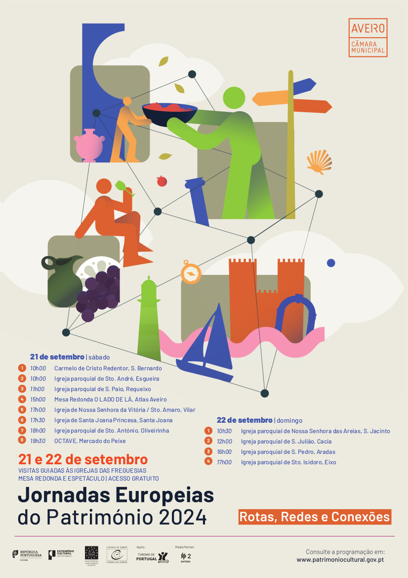 Procurando descentralizar as iniciativas culturais no concelho de Aveiro, os Museus de Aveiro juntam-se a esta iniciativa oferecendo ao público visitas guiadas às igrejas das freguesias do concelho, explorando a sua história, bem como o património artístico existente. Espaços a visitar: 21 de setembro (sábado) 1\\. Carmelo de Cristo Redentor, S. Bernardo – 10h00 2\\. Igreja de Nossa Senhora da Vitória /Sto. Amaro, Vilar – 17h00 3\\. Igreja paroquial de Sto. António, Oliveirinha – 18h00 4\\. Igreja paroquial de S. Paio, Requeixo – 11h00 5\\. Igreja de Santa Joana Princesa, Santa Joana – 18h00 6\\. Igreja paroquial de Sto. André, Esgueira – 10h00 22 de setembro (domingo) 1\\. Igreja paroquial de S. Pedro, Aradas – 16h00 2\\. Igreja paroquial de Sto. Isidoro, Eixo – 17h00 3\\. Igreja paroquial de Nossa Senhora das Areias, S. Jacinto – 10h30 4\\. Igreja paroquial de S. Julião, Cacia – 12h00 Integra ainda a programação o espetáculo OCTAVE, uma performance sonora e visual que explora a ligação do cinema e da música numa sucessão de “clips” manipulados ao vivo cruzando várias estéticas e técnicas. O projeto é constituído por Pedro Cardoso (Músico e Sonoplasta) e José Pires (Cineasta), a ter lugar sábado, dia 21.09, às 19h30, no Mercado do Peixe/Mercado José Estevão. Todas as ações são de acesso livre.
