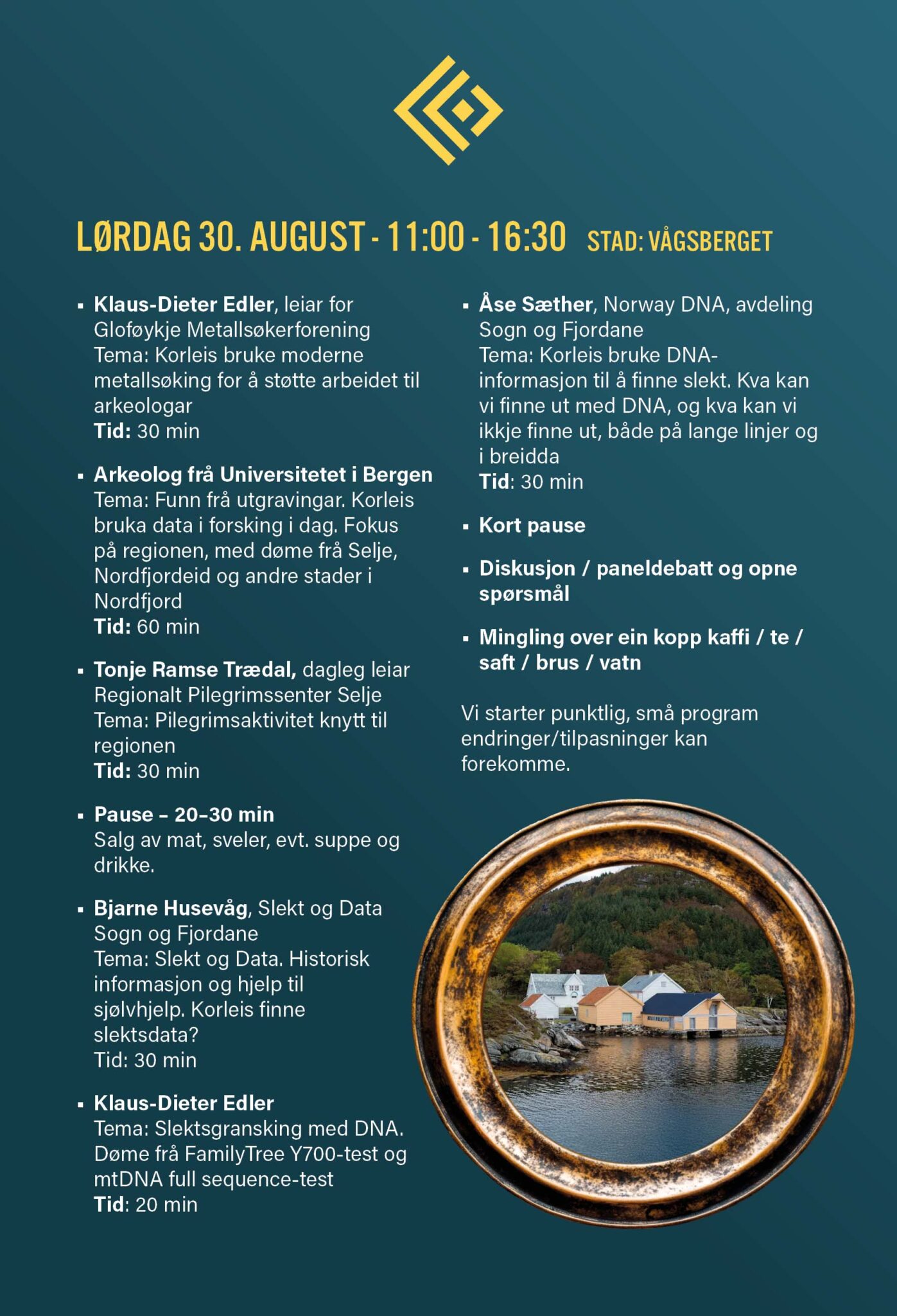 Kulturverndagene i Kinn arrangeres av Gloføykje Metallsøkerforening Vi inviterer til foredrag rund historie og historiske funn i regionen ytre Nordfjord. Det blir også foredrag om Slekt og Data, bruk av DNA i historisk sammenheng og personlig, men også om Pilegrims aktivitet i regionen. Det er en unik mulighet til å få kontakt og spørre om alt rund foredragene. Årets tema for Kulturverndagene er HJEM – utvikling, utvandring, utveksling Hjem handlar om staden vi høyrer til, naturen, fjordane og fjella rundt oss, også her i Kinn kommune. Landskapet er forma av istida og har sett sitt preg på liva våre gjennom generasjonar. Kysten vår ber spor av ei rik historie, frå steinalder, vikingtid, mellomalder og moderne tid, og historia kjem til syne i gamle gardar, steinrøyser, hustufter, gravhaugar og kulturminne langs kysten i heile regionen. Gjennom tidene har vi sett stor utvikling, handel og utveksling, som i vikingtida, gjennom hanseatane og jektefarten til Bergen. På 1800-talet kom bølgjer av utvandring, mellom anna til USA og Canada. Desse tema pregar årets kulturverndagar over heile Noreg. Vi ønskjer å løfte fram historia vår, handverkstradisjonane, dans, musikk, kystkultur, og ikkje minst den immaterielle kulturarven, historiene og forteljingane. Kulturverndagen i Kinn markerer starten på eit felles arbeid for å ta vare på denne arven i regionen og i heile Nordfjord. Det er viktig å verne om kultur og kulturarv og gi rom for det, for det er òg ein del av vår eigen identitet, uansett nasjonalitet, kvar du er fødd, kvar du voks opp, eller kvar du lever i dag. Bli med, åleine eller saman med foreiningar, og kanskje finn du di eiga historie. Kulturminnehelsing, Klaus-Dieter Edler, ein hanseat frå Lübeck, busett i Nordfjord Styreleiar, Vestland Kulturvernnettverk