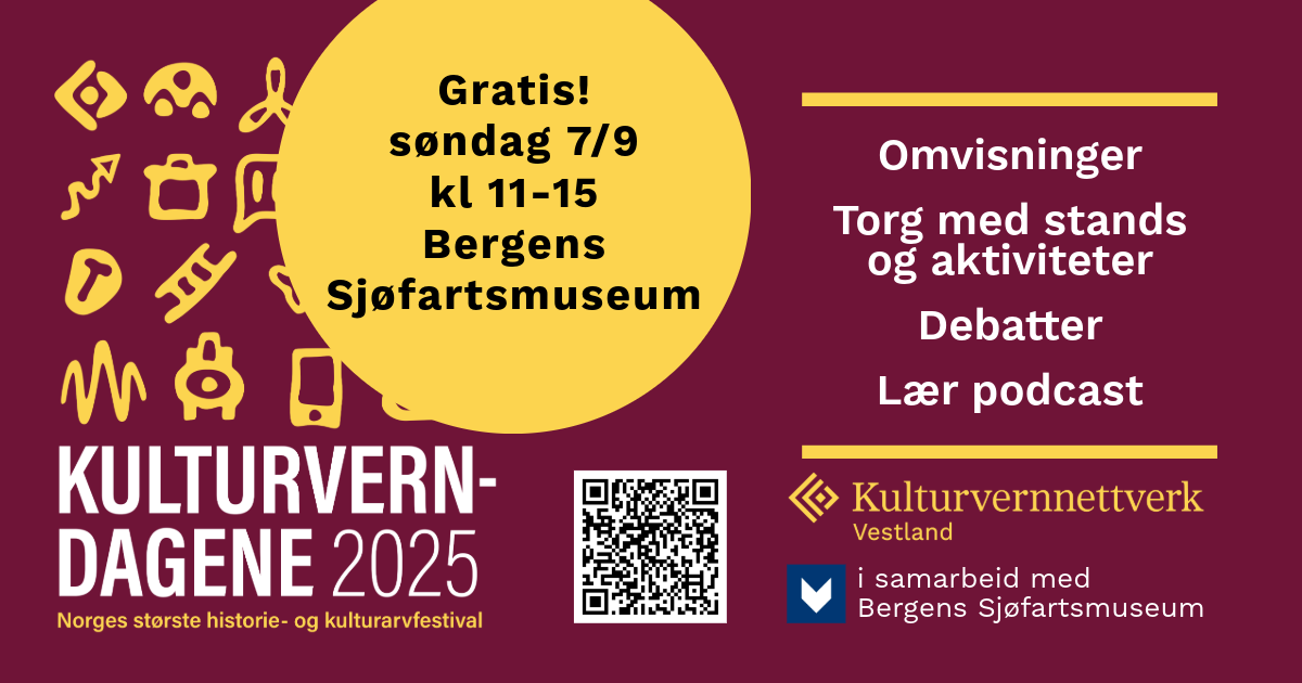 Søndag 7. september kl. 11–15 inviterer vi til Kulturverndagene 2025 på Bergens Sjøfartsmuseum – en del av Norges største historie- og kulturarvfestival – Arrangementet er gratis og åpent for alle. På museet kan du oppleve Et torg med spennnende stands og aktiviteter