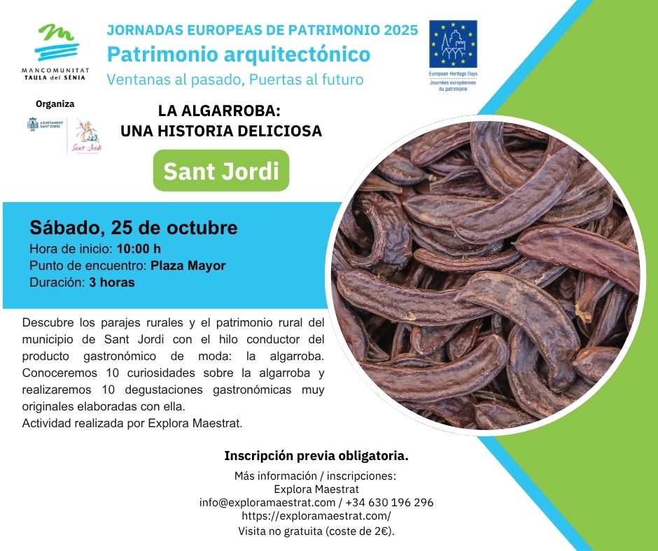 Descubre los parajes rurales y el patrimonio rural del municipio de Sant Jordi con el hilo conductor del producto gastronómico de moda: la algarroba. Conoceremos 10 curiosidades sobre la algarroba y realizaremos 10 degustaciones gastronómicas muy originales elaboradas con ella.