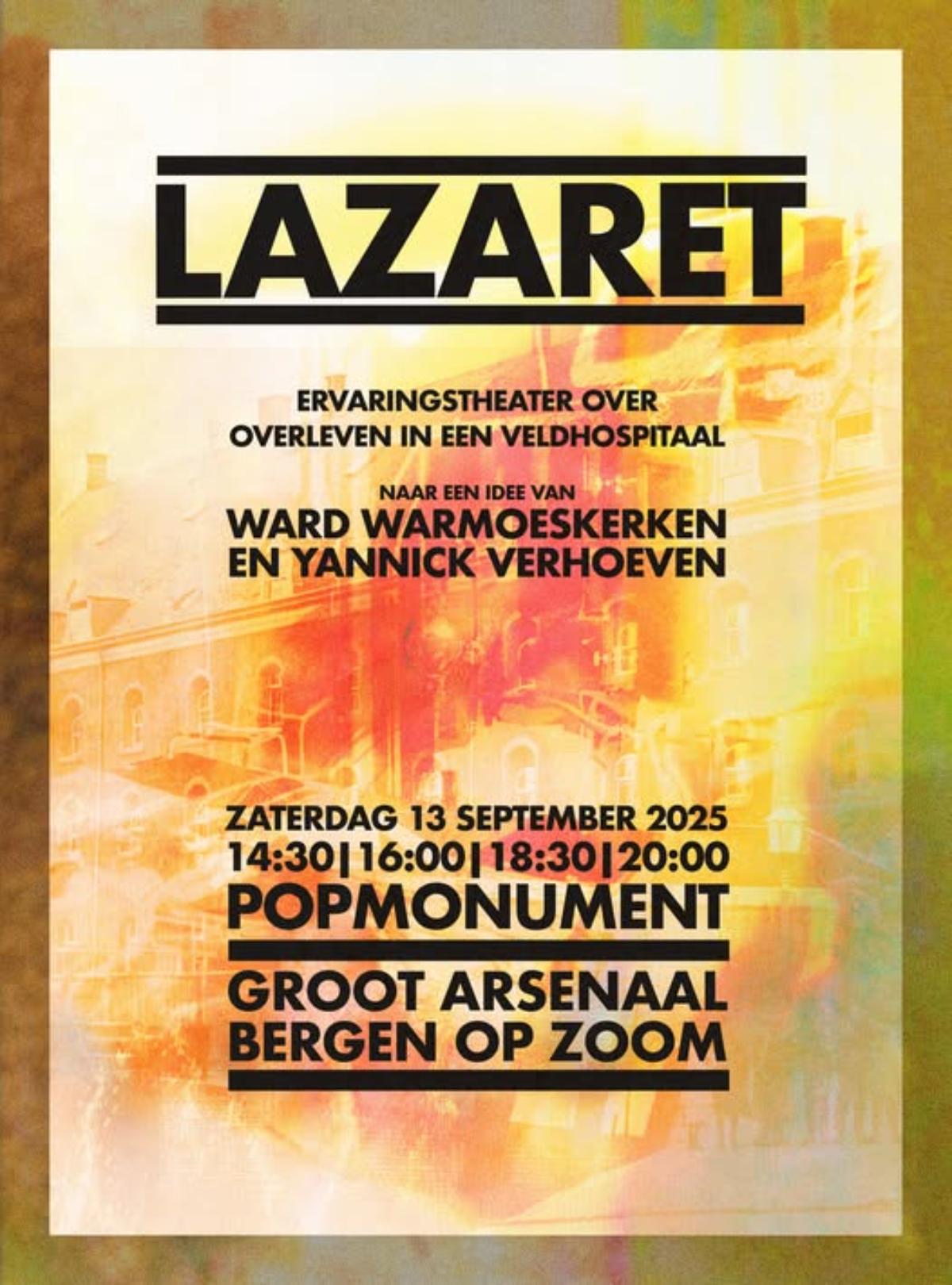 LAZARET van Ward Warmoeskerken & Ramses3000: ervaringstheater over het overleven in een veldhospitaal landt op zaterdag 13 september in het Groot Arsenaal tijdens PopMonument Bergen op Zoom. 𝙏𝙞𝙘𝙠𝙚𝙩𝙨 Toegang tot Lazaret is inbegrepen in je festivalticket, maar het reserveren van een tijdstip is wel nodig vanwege de beperkte capaciteit. Je kunt je tijdslot (per persoon, kosteloos) reserveren via deze link: https://popmonument.nl/event/lazaret-boz/