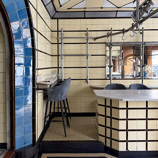 Originally a neoclassical house dating from 1874, the ground floor was turned into a shop in 1911, and then, more specifically, a butcher’s shop in 1921. Architect Louis Verbeyst remodelled the building in 1930, but it was in 1943 that architect François Mees gave the facade its current appearance, in a modernist style mixed with Art Deco. While the first-floor bay is surrounded by yellow glazed panels, the ground floor, with its axial oak door and two sash windows in the same material, is clad in the same cream-coloured ceramic tiles as the interior, this time punctuated by thin black bands. The premises, which today house a restaurant, have managed to preserve the metal rods and marble display units of the former butcher’s shop, the ceiling decorated with diamond-shaped marble panels and the round-arched door leading to the kitchen. The kitchen features openwork panelling and a blue-tiled frame. All in all, a most interesting Art Deco-style decorative ensemble. (CL 07/10/2021)