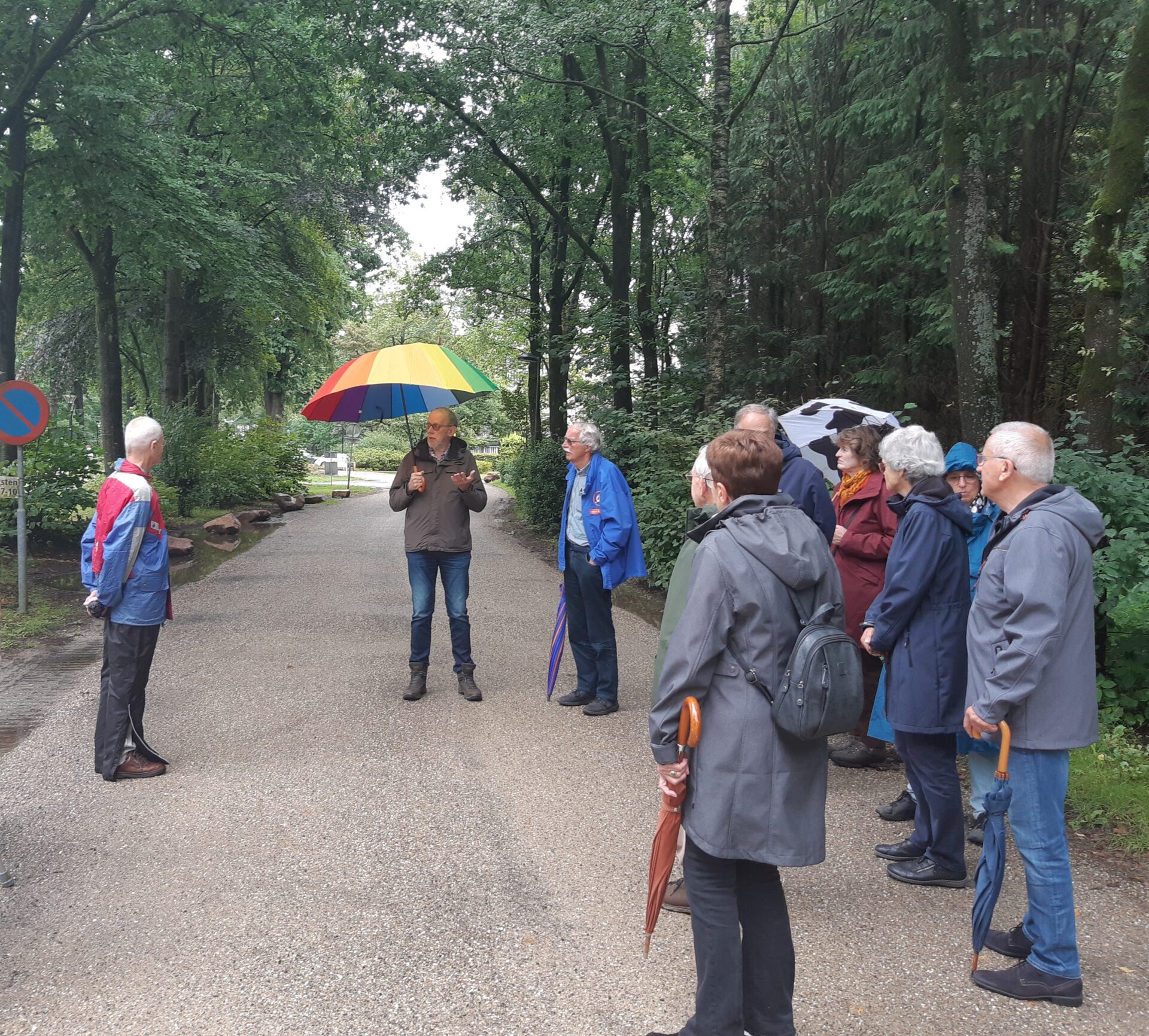 Tijdens de wandeling vertelt gids Henk allerlei wetenswaardigheden over ruim 2 eeuwen historie van het landgoed, de verschillende gebouwen, waaronder het in Neorenaissance-stijl gebouwde ‘paleis’ Hydepark dat in 1945 door een ontploffing verwoest werd, en over de nog aanwezige rijksmonumenten (tuinmanhuis, portierswoningen, stokerswoning, ijskelder, boerderij met stallen en Oranjerie met berceau). Verder komen de (voorname) bewoners van deze huizen, de grootte en ontstaansgeschiedenis van het landgoed en de inrichting door een bekende landschapsarchitect aan bod. In het begin van de 19e eeuw was een groot deel van het gebied tussen de Driebergsestraatweg en de Oude Arnhemsebovenweg in Doorn eigendom van Sophie van Hardenbroek. In 1830 koopt Gerhard Hoff het huis en de gronden. In 1835 krijgt hij de gronden ten noorden van de Arnhemsebovenweg in erfpacht van de Domeinen. Hierdoor ontstaat een landgoed van ongeveer 140 hectaren. Na verschillende eigenaren kwam het landgoed in 1885 in handen van bankier Hendrik Maurits Jacobus van Loon, die het landgoed Heidepark liet omvormen tot het huidige Hydepark. De Amsterdamse architect H.N. Landré ontwierp een nieuw hoofdhuis en bijgebouwen, geïnspireerd door de Franse architectuur van Lodewijk XIV. De gebroeders Copijn ontwierpen en legden het landschapspark aan. Tijdens de oorlog werd Hydepark bezet door de Duitse bezetters en diende het als hoofdkwartier voor de arbeidsdienst. Het landhuis werd door brand en later door een ontploffing verwoest. De Oranjerie, gebouwd tussen 1885 en 1888, is een rijksmonument en een overblijfsel van de 19e eeuwse aanleg. Het diende als onderkomen voor de exclusieve plantencollectie van Van Loon. Tegenwoordig is de Oranjerie een trouw- en vergaderlocatie en is de formele tuin een overblijfsel van de historische aanleg. x. Volgens het Rijksmonumentenregister is de historische tuin- en parkaanleg op het huidige landgoed Hydepark in ‘late landschapsstijl met geometrische tuinelementen’. De plek waar het ‘paleis Hydepark’ ooit stond is het belangrijkste centrum van de aanleg, waar vanuit een zevental uitwaaierend zichtassen in zuidelijke richting lopen. Een aantal van de zichtlijnen is waarneembaar vanaf de westelijke oprijlaan. Van de twee andere zichtassen boven de huisplaats van Hydepark kijkt een uit op het voormalige hertenkamp en een oostelijk zicht sluit aan op een van de drie zichten van de villa La Forêt. Het klokvormige licht glooiende gebied ten noorden van de Driebergsestraatweg heeft voornamelijk een open landschappelijk karakter, met oorspronkelijk een netwerk van slingerpaden. Het gebied is beplant met doelbewust geplaatste solitaire bomen en struiken die de dieptewerking versterken. Nabij de Driebergsestraatweg ligt een onregelmatig gevormde vijver, waar oorspronkelijk twee beekjes in uitmondden die de vijver van vers water voorzagen. Op de westelijke oprijlaan zijn aftakkingen die naar bijgebouwen leiden. De meest zuidelijke aftakking loopt langs een hoog opgeworpen met loofbomen beplante heuvel, waarop oorspronkelijk de watertoren stond. Aan de westzijde van de heuvel bevindt zich een ijskelder en de weg vervolgt zich tot achter de Oranjerie en eindigt op de Hydeparklaan. De zichtas vanaf de Oranjerie op de huisplaats van Hydepark is verstoord, ondanks een in 1994-’95 gerestaureerde berceau. Tussen de berceau en de Oranjerie ligt een rechthoekige verdiepte geometrische tuin met een vijver, border en omzoomd door struiken. Noordelijk is een derde aftakking langs een ovaalvormige rozentuin naar het koetshuis en het boerderijcomplex. De rozentuin was volgens een geometrisch patroon verdeeld in kleinere perken waarin honderden verschillende soorten rozen waren geplant en welke binnen het oeuvre van Hendrik Copijn een nieuw element vormden. Daarvóór waren de ontwerpen van Copijn in ‘pure’ landschapsstijl, waarbij de paden als het ware met de passer waren te volgen. Het ontwerp van Hydepark is een van Copijns eerst uitgevoerde ontwerpen met geometrische deeltuinen. Het zuidwestelijke deel van het park heeft een voornamelijk agrarisch karakter met langs de Hydeparklaan een drietal weilanden. Meer noordelijk heeft het gebied een glooiend karakter en gaat over in het parkbos. In dit noordwestelijke deel ligt een slingervijver die nabij de Oude Arnhemsebovenweg eindigt maar eertijds onder de weg doorliep over de achterplaats. Bij de overgang van weide naar bos liggen bij de vijver cementrustieke rotsen en een brug van cementrustieke boomstammen. Dit noordoostelijke parkbos heeft een gemengd karakter van loof- en naaldbomen met onverharde slingerpaden. Een rechte beukenlaan en noord-zuidas op huis Hydepark komt noordelijk uit op de tunnel (onder de Oude Arnhemsebovenweg) of grotto die hier een van de verbindingen met de overplaats, tegenwoordig een camping en begraafplaats, vormde. De overplaats kon ook via een brug van cementrustieke boomstammen bereikt worden. Het gebied ten noordoosten van de huisplaats van Hydepark wordt grotendeels ingenomen door een weide die oorspronkelijk als hertenkamp gebruikt werd. De weide werd door een beekje met cascade in twee helften gedeeld. De oevers van het beekje waren met boom- en struikgroepen beplant. Deze begroeiing is nog aanwezig en geven het terrein een extra dieptewerking. Over de weide loopt een zichtas richting de plaats van het verdwenen landhuis. Ten zuiden van de weide staat een houten prieel met daarachter op een langwerpige heuvel een verhoogd pad met aan weerszijden imitatie rotsen. Oostelijk van het hertenkamp ligt een klein tenniscomplex met een oorspronkelijk hekwerk van omstreeks 1900. Het tennishuisje is een 20e-eeuwse interpretatie van de voorganger. Het gebied ten noorden van het tenniscomplex valt buiten de bescherming.