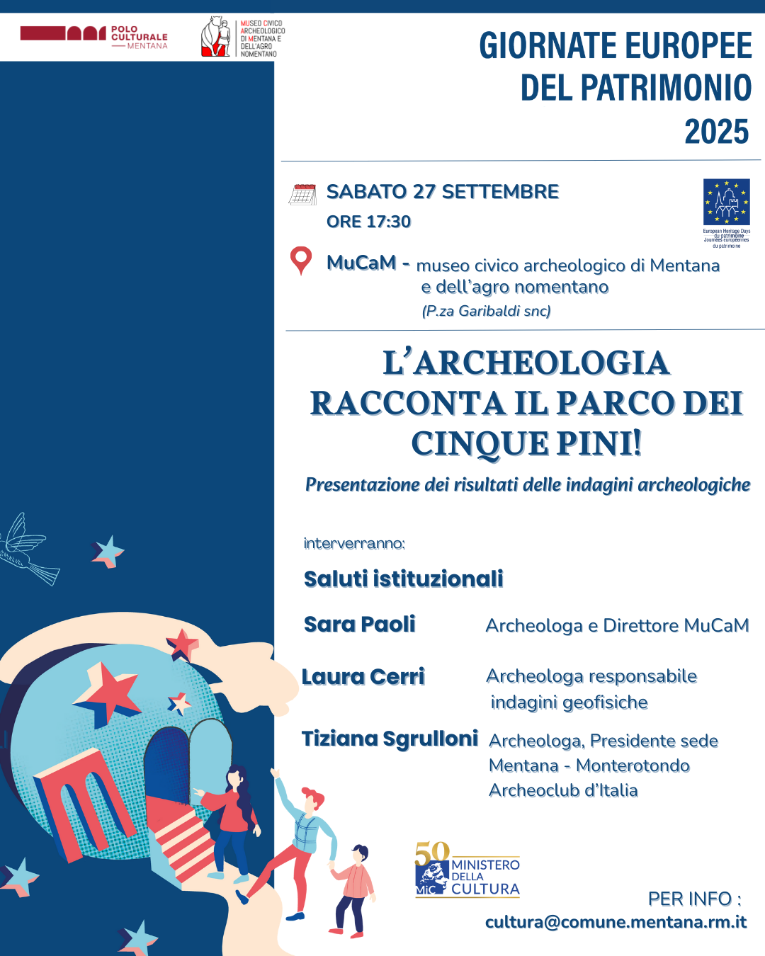 L'archeologia racconta ii Parco dei Cinque Pini! Presentazione dei risultati delle indagini archeologiche, su concessione di scavo del Ministero della Cultura all'interno del parco comunale dei Cinque Pini, caratterizzato per la presenza di una cisterna romana del II secolo d.C. Programma dell'evento Saluti istituzionali lnterverranno: Sara Paoli archeologa e direttore MuCaM Laura Cerri, archeologa responsabile indagini geofisiche effettuate nell'area di scavo Tiziana Sgrulloni, archeologa, Presidente sede Mentana-Monterotondo Archeoclub d'ltalia, associazione partner del progetto scientifico © 2021 MiC - Pubblicato il 2025-09-11 10:08:30 / Ultimo aggiornamento 2025-09-11 13:58:19