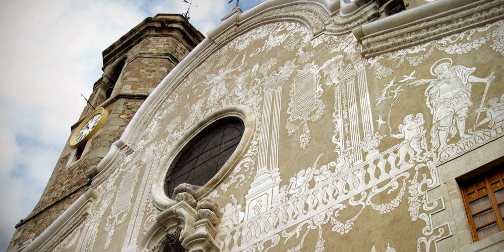 La magnífica façana de l'església parroquial de Sant Celoni té la decoració esgrafiada barroca (1762) més destacada de Catalunya. S'estructura en forma de retaule, amb virtuts, àngels músics, la glòria celestial... L'itinerari segueix a l'interior del temple i acaba amb la pujada al campanar, amb unes vistes espectaculars de la vila.
