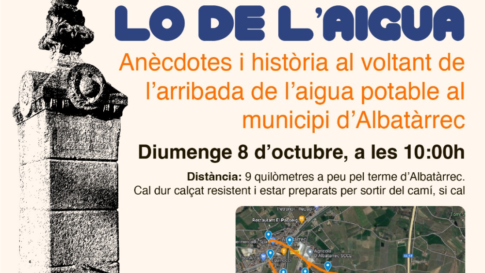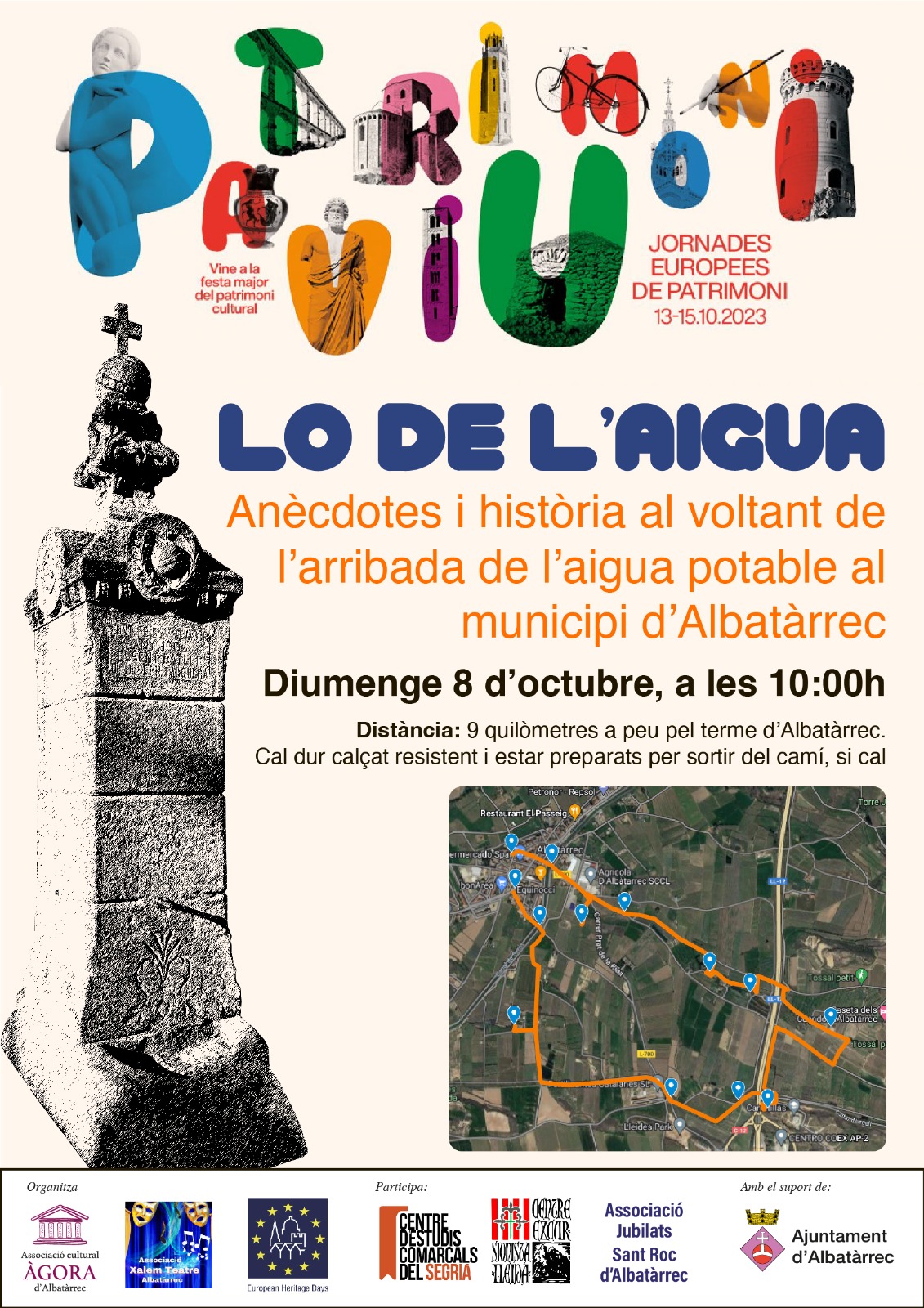Anècdotes i història al voltant de l’arribada de l’aigua potable a Albatàrrec. Activitat emmarcada dins de les Jornades Europees de Patrimoni. Diumenge 8 d’octubre de 2023 10:00 hores Porta de les Escoles Velles, actual Consultori. Sant Salvador, Albatàrrec Recorregut a peu (9 quilòmetres) pel terme d’Albatàrrec on hi trobarem edificacions construïdes entre el 1906 i el 1929 per dotar a la població d’aigua potable . També visitarem alguna de les restes de la Guerra Civil 1936-39, documentades a les “Rutes de la Guerra 1936-39 a Albatàrrec”. En el recorregut ens explicaran fets concrets que ens aproparan a com al poble i al terme d'ara fa cent anys. Organitza: Associació Cultural Àgora d’Albatàrrec i Associació Xalem Teatre Albatàrrec. Participa: Centre d’Estudis Comarcals del Segrià, Associació de Jubilats “Sant Roc” d’Albatàrrec, Grup de Memòria Històrica del Centre Excursionista de Lleida. Amb el suport: Ajuntament d’Albatàrrec No us podeu perdre aquesta gran festa del patrimoni.