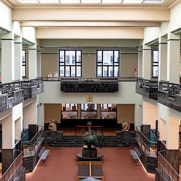 After experimenting with Art Nouveau, after the First World War Jean-Baptiste Dewin adopted a style influenced by Art Deco and the International School. He put his knowledge into practice on the new Forest Town Hall, which he designed in 1925. However, it was not until 1934 that work could begin. A 50 m-high belfry towers over a massive building of yellow brick, bluestone and concrete, the preferred materials of the period. The tower is adorned with a clock and four sculpted bronze groups symbolising municipal rights. Restored to their former glory, they are again shining brightly since the town hall recently underwent a major restoration. Dewin’s architecture was functional and logical, but not without a certain luxury, as exotic woods (avodire, ebony, bubinga, iroko kambala) and polished marble form the basis of the interior decor. Inaugurated in 1938, the town hall features a vast two-storey office under a zenithal glass roof, as well as a large hall with a grand staircase, with facings combining white Carrara marble, blue Bioul marble and black Mazy marble, a beautiful ensemble complemented by stained glass windows and wrought ironwork (listed 10/22/1992). In collaboration with Arkadia (FR), ARAU, Atelier de Recherche et d'Action Urbaines (FR) and Korei Guided Tours (NL)