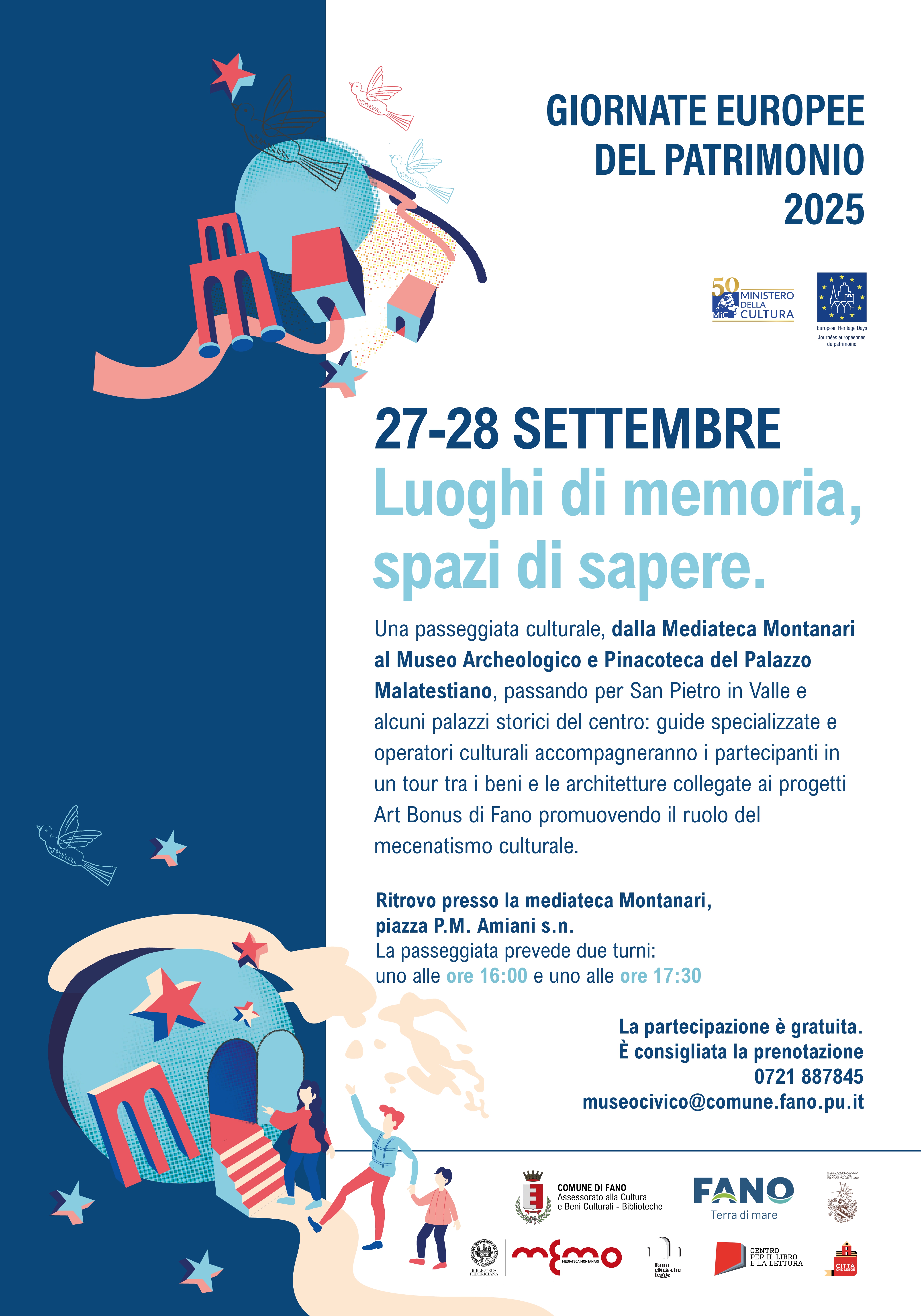 “Luoghi di memoria, spazi di sapere”, una passeggiata culturale dedicata ai progetti Art Bonus della città. L’itinerario – articolato in quattro appuntamenti tra sabato 27 e domenica 28 settembre (due alle ore 16:00 e due alle ore 17:30)– toccherà la Mediateca Montanari, San Pietro in Valle, alcuni palazzi storici del centro e il Museo Archeologico e Pinacoteca del Palazzo Malatestiano, valorizzando le architetture collegate ai beni oggetto di Art Bonus e promuovendo il ruolo del mecenatismo culturale. Per partecipare alla passeggiata occorre prenotare telefonando ai recapiti sotto riportati. © 2021 MiC - Pubblicato il 2025-09-11 10:50:36 / Ultimo aggiornamento 2025-09-12 08:47:07