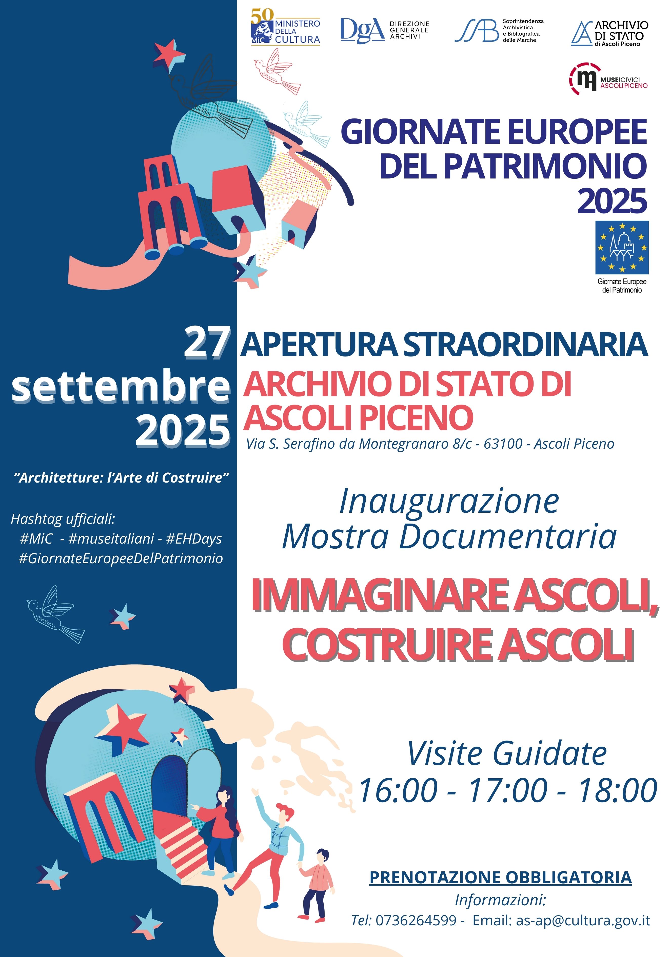 Giornate Europee del Patrimonio 2025 “Architetture: l’arte di costruire” Apertura Straordinaria dell’Archivio di Stato di Ascoli Piceno – Mostra documentaria: “IMMAGINARE ASCOLI, COSTRUIRE ASCOLI” L’Archivio di Stato di Ascoli Piceno aderisce alle Giornate Europee del Patrimonio 2025, dedicate al tema “Architetture: l’arte di costruire”, declinazione italiana del tema europeo “Heritage and Architecture: Windows to the Past, Doors to the Future”. L’edizione 2025 celebra i 50 anni dall’Anno Europeo del Patrimonio Architettonico (1975) e invita a esplorare il ricco e variegato paesaggio architettonico che ci circonda, riflettendo sul ruolo dell’architettura nella memoria, nell’identità e nella vita delle comunità. Il plurale “Architetture” sottolinea la molteplicità di tipologie e funzioni del patrimonio costruito: dai monumenti celebri degli centri storici agli edifici meno noti delle aree rurali e industriali. “L’arte di costruire” valorizza la varietà di stili, materiali e saperi che hanno modellato l’ambiente costruito europeo, dalla preistoria a oggi, e promuove la conoscenza del patrimonio immateriale legato a tecniche, pratiche culturali e sistemi di convivenza, invitando a riflettere anche su sostenibilità, innovazione e accessibilità. In questo contesto, l’Archivio di Stato di Ascoli Piceno propone un’apertura straordinaria con la mostra documentaria: “IMMAGINARE ASCOLI, COSTRUIRE ASCOLI” 📍 Archivio di Stato di Ascoli Piceno 📅 Sabato 27 settembre 2025 – ore 16:00 In collaborazione con AscoliMusei La mostra presenterà documenti originali, alcuni inediti, che raccontano le trasformazioni urbanistiche della città dal XIX secolo, con particolare attenzione alla costruzione di palazzi pubblici e privati. Saranno inoltre esposti materiali progettuali più antichi provenienti dai fondi notarili conservati dall’Istituto, a testimonianza delle conoscenze tecniche e delle pratiche culturali che hanno plasmato Ascoli nel corso dei secoli. 🔎 Visite guidate: ore 16:00 – 17:00 – 18:00 📌 Prenotazione obbligatoria per garantire la migliore accoglienza del pubblico ℹ️ Info e prenotazioni: ☎️ 0736 264599 📧 as-ap@cultura.gov.it Con questa iniziativa, l’Archivio di Stato di Ascoli Piceno offre ai cittadini e ai visitatori un’occasione unica per scoprire l’architettura come espressione viva della storia, della cultura e delle aspirazioni delle comunità italiane ed europee, valorizzando al contempo la memoria, le tecniche e le idee che hanno costruito la città. Gli hashtag ufficiali sono: #MiC #museitaliani #EHDays #GiornateEuropeeDelPatrimonio © 2021 MiC - Pubblicato il 2025-09-18 08:41:27 / Ultimo aggiornamento 2025-09-18 10:54:48