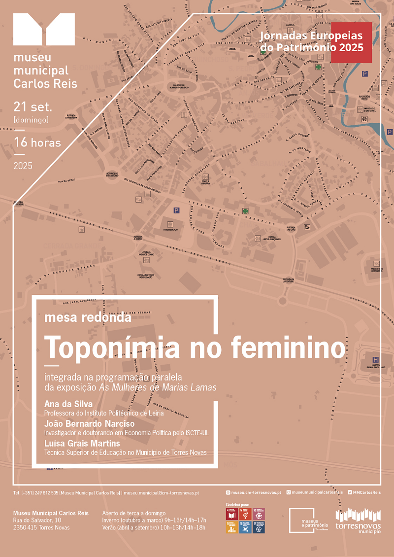 Decorrerá no dia 21 de setembro uma mesa-redonda sobre a representação de género na toponímia, com a apresentação de três casos: Porto, Santarém e Torres Novas. “Toponímia no Feminino” é o mote para vos receber no Museu Municipal Carlos Reis, pelas 16h, e integra-se na programação de ativação da exposição “As Mulheres de Marias Lamas”, com curadoria de Jorge Calado, patente no museu até 6 de outubro de 2025, e que convidamos todos a visitar. Este contexto expositivo tem sido pretexto para múltiplas escutas, discussões e reflexões em conjunto com grupos diversificados que nos têm acompanhado ao longo das diversas atividades. Este momento de conversa, sobre e para a construção de pensamento(s), discurso(s) e prática(s) feminista(s) nas relações quotidianas, e contribuição dos contextos territoriais, terá como convidados Ana da Silva, Professora do Instituto Politécnico de Santarém, João Bernardo Narciso, investigador e doutorando em Economia Política pelo ISCTE-IUL e Luísa Grais Martins, Técnica Superior de Educação. Esta iniciativa insere-se no programa das Jornadas Europeias do Património 2025.