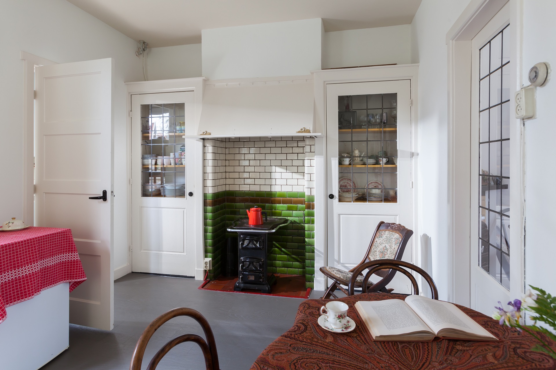 Historie van het complex Musschenberg Het complex ‘Musschenberg’ is gebouwd in 1910. De huurprijs voor een woning bedroeg f 3,55 tot f 5,30 per week! Vanwege de rode dakpannen kreeg de buurt al gauw de bijnaam het ‘Rode Dorp’. Koninklijke belangstelling Een bijzonder complex dat landelijk veel belangstelling kreeg en zelfs in 1912 werd opgenomen in de rijtoer tijdens een koninklijk bezoek aan Arnhem. Bijzondere kenmerken van de woning In de woonkamer bevindt zich een haardpartij met geglazuurde stenen en een stalen kap, ingepast tussen twee servieskasten. De trap wordt gekenmerkt door een rijke betimmering. Op het tussenbordes treft men ‘balatum’ aan, één van de eerste vloerbedekkingen op basis van geïmpregneerd wolviltpapier, gemaakt in Engeland in 1908 door Charles Richard Leech. Kijk ook goed naar het houten schuurtje, dat in de beginjaren dienst deed als varkenshok. De achtertuin werd gebruikt als moestuin. Een reis terug in de tijd Een prachtige woning, zoveel mogelijk ingericht naar de tijd van toen, met een bewoner die u graag alles vertelt over vroeger. Meer informatie op www.museumwoningenarnhem.nl (foto: Rob Kater Photography) Meer informatie op www.museumwoningenarnhem.nl