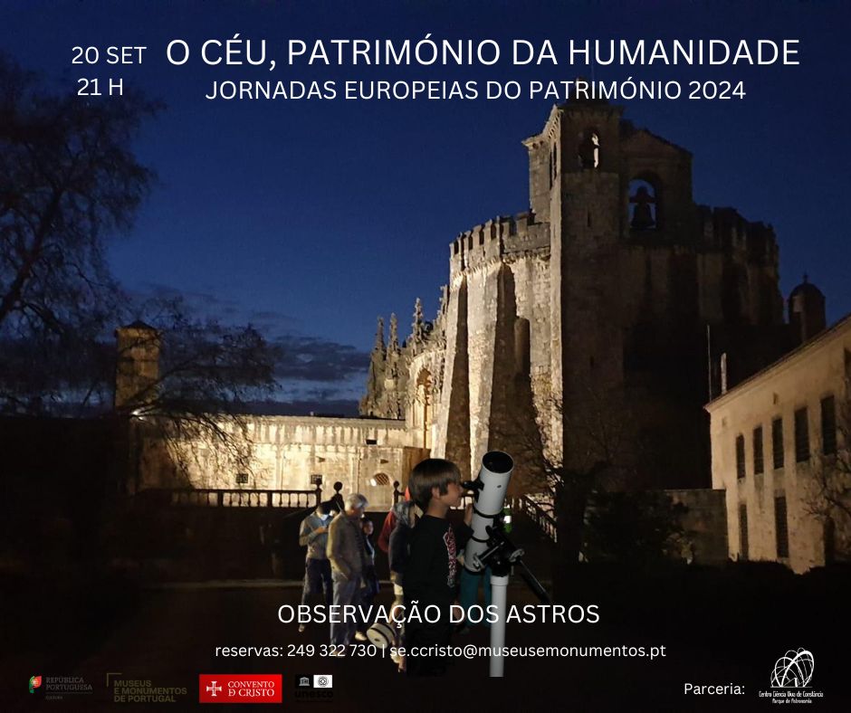 A atividade de observação dos astros "O CÉU PATRIMÓNIO DA HUMANIDADE" é uma parceria do Convento de Cristo e do Centro de Ciência Viva de Constância e terá lugar no dia 20 de setembro pelas 21h no Terraço da Cera, no Convento de Cristo. Nesta atividade pretende-se observar o céu com telescópios (Lua, Saturno, enxames de estrelas...) identificar constelações e citar histórias e lendas associadas a estas. A atividade é dirigida a um público dos 6 aos 80 anos. Aconselhamos a que tragam uma mantinha para maior conforto. Número máximo de participantes 30.
