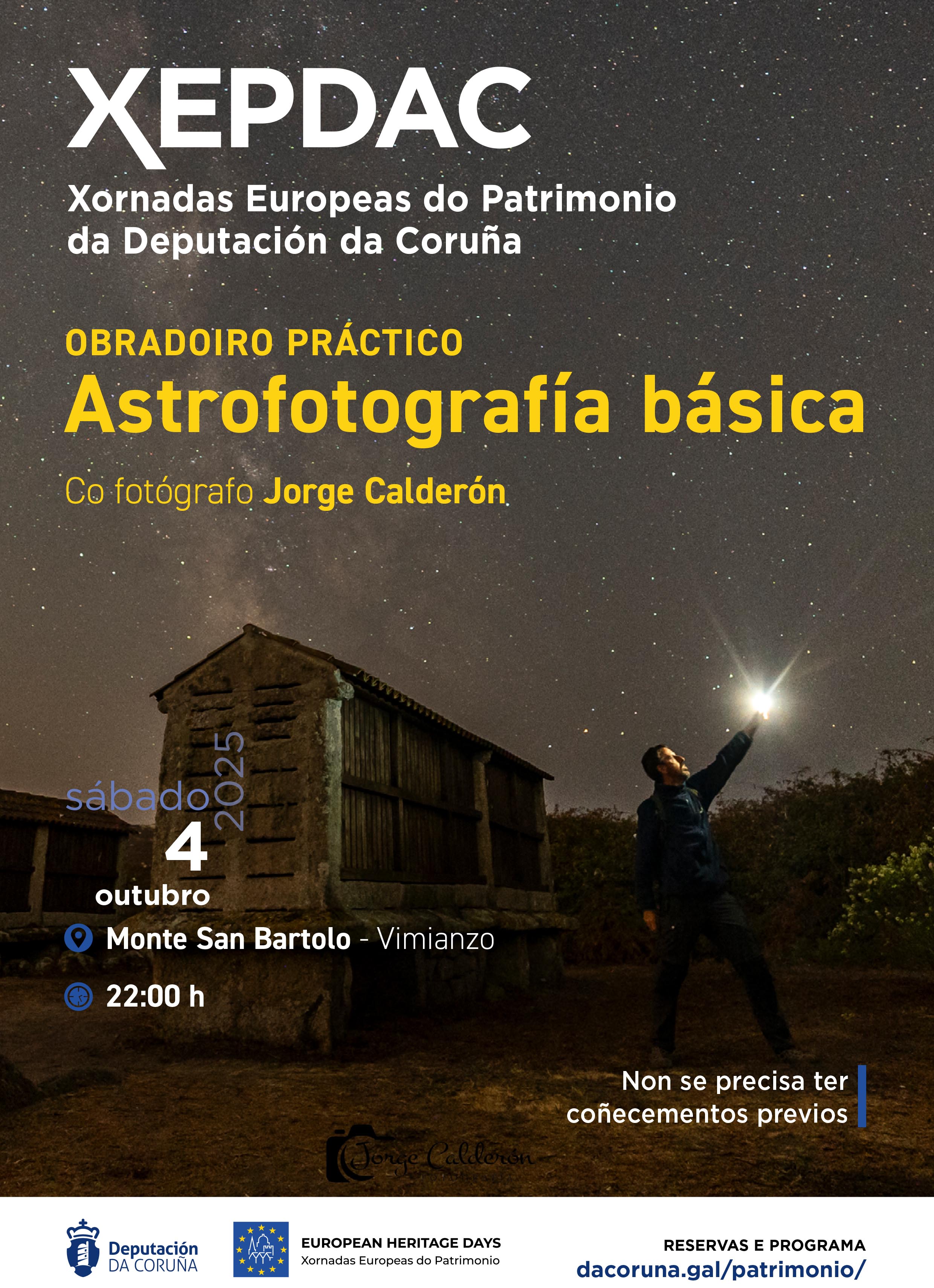 Obradoiro de astrofotografía básica nun dos miradoiros Starlight da Costa da Morte, con impresionantes vistas sobre o val de Vimianzo e escasa contaminación lumínica. O obradoiro está destinado a xente sen coñecementos que desexe aprender e coñecer como son as técnicas para captar fotografía nocturna e astrofotografía de paisaxe, e tamén xente que, tendo algo de experiencia queira corrixir erros e perfeccionar esa técnica.