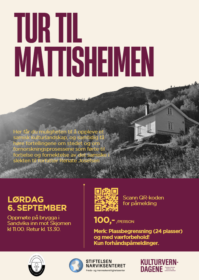 I år markerer Stiftelsen Narviksenteret, Narvik Sameforening og Narvik bibliotek de nasjonale kulturverndagene med temaet “Ofotens historie i et samisk perspektiv”. Dette passer fint inn i kulturverndagenes hovedtema HJEM – Utvikling, utvandring, utveksling som går av stabelen 30.august til 7. september. Ofotenregionen ligger midt i samiske kjerneområder, og bærer stort preg av både utvikling, utvandring og utveksling av mange ulike folkeslag. Den samiske historien i regionen blir gjennom denne uken løftet fram på ulike måter. Dette arrangementet foregår på Mattisheimen i Skjomen. I spektakulære omgivelser får vi et nærmøte med Mattisheimen – en gang en gård med samisk tilstedeværelse, i det bratte terrenget ved innløpet til Skjomenfjorden. Stedet eies i dag av forfatter Renate Josefsen, som har startet sin reise med å finne tilbake til sine samiske røtter. På mange måter er Mattisheimen en del av Renates samiske hjemreise. Her får du muligheten til å oppleve et samisk kulturlandskap, og samtidig få høre fortellingene om stedet og om fornorskningsprosessene som førte til fortielse og fornektelse av det samiske i slekten til Renate. Turen starter med båtskyss fra Ofoten Kystlag fra brygga i Sandvika på tur innover mot Skjomen, og over på andre siden av fjorden hvor stien opp til Mattisheimen begynner. Dette er ikke en tur for de minste, og for de som har problemer med å gå i ulendt, bratt terreng. Man må selv komme seg til Sandvika. Ta med gode sko, vannflaske og nistepakke. Det vil bli servert kaffe på Mattisheimen. Merk: Plassbegrensning (maks 24 plasser) og med værforbehold! Kun forhåndspåmeldinger. Turen bestilles via cd@narviksenteret.no. Billett for båttransport: 100,- pr pers. Dato: Lørdag 6. september 2025. Oppmøte på brygga i Sandvika inn mot Skjomen kl 11.00. Retur kl. 13.30.