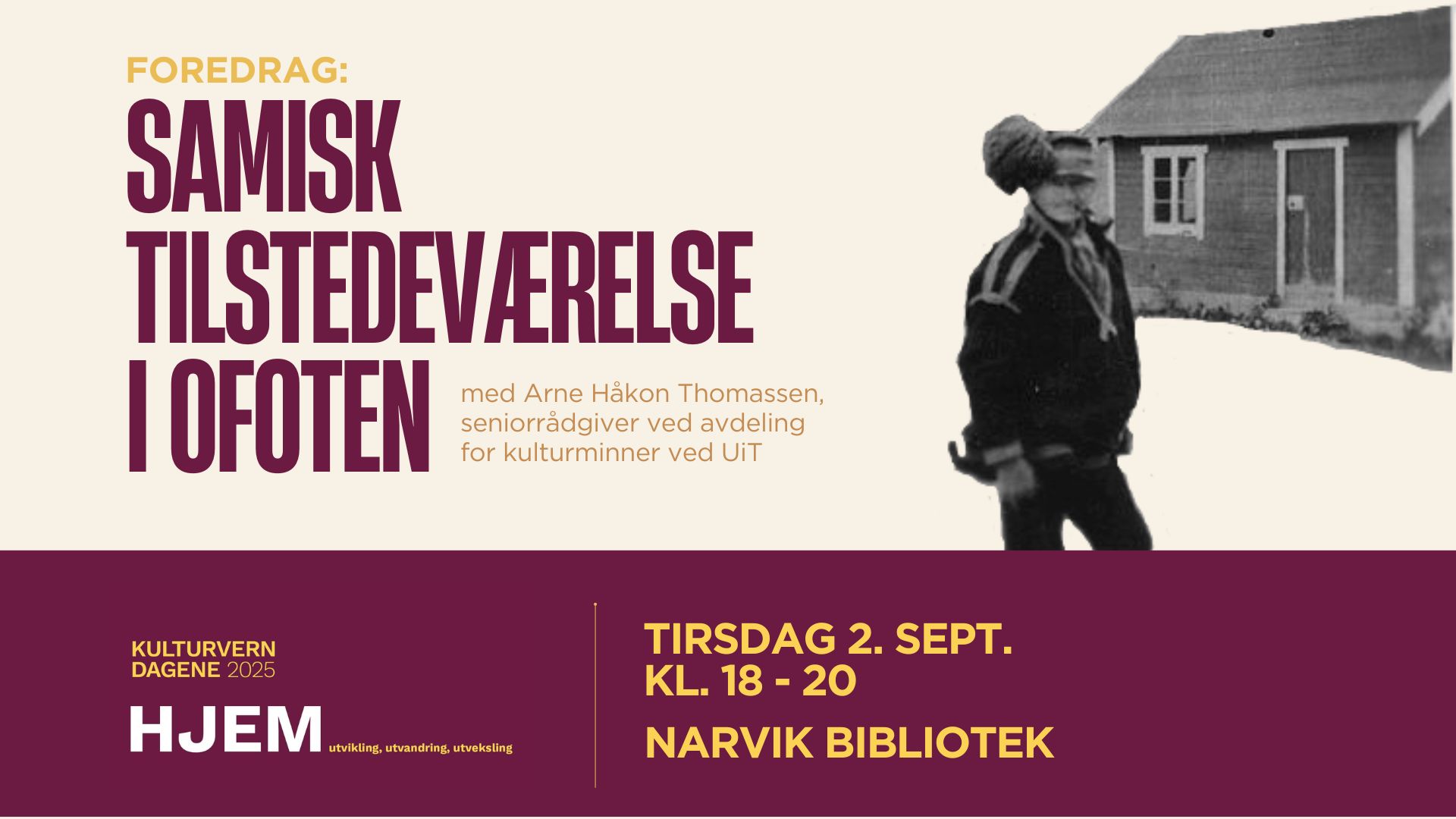 I år markerer Stiftelsen Narviksenteret, Narvik Sameforening og Narvik bibliotek de nasjonale kulturverndagene med temaet “Ofotens historie i et samisk perspektiv”. Dette passer fint inn i kulturverndagenes hovedtema HJEM – Utvikling, utvandring, utveksling som går av stabelen 30.august til 7. september. Ofotenregionen ligger midt i samiske kjerneområder, og bærer stort preg av både utvikling, utvandring og utveksling av mange ulike folkeslag. Den samiske historien i regionen blir gjennom denne uken løftet fram på ulike måter. Dette arrangementet er et foredrag med rom for mingling i etterkant. Foredrag i Narvik, biblioteket. I dette foredraget møter du Arne Håkon Thomassen, seniorrådgiver ved avdeling for kulturminner ved UiT. Han vil lose oss gjennom samisk kulturarv, kulturhistorie og kulturminner, mens han knytter dette til identitet og revitalisering av det samiske i regionen. Etter foredraget vil det bli servert kaffe og noe å bite i, mens det lages rom for gode samtaler og mingling. Arrangørene håper så mange som mulig benytter seg av anledningen til å bli igjen en liten stund for å enten bli bedre kjent med det samiske i regionen, eller stifte nye bekjentskaper.