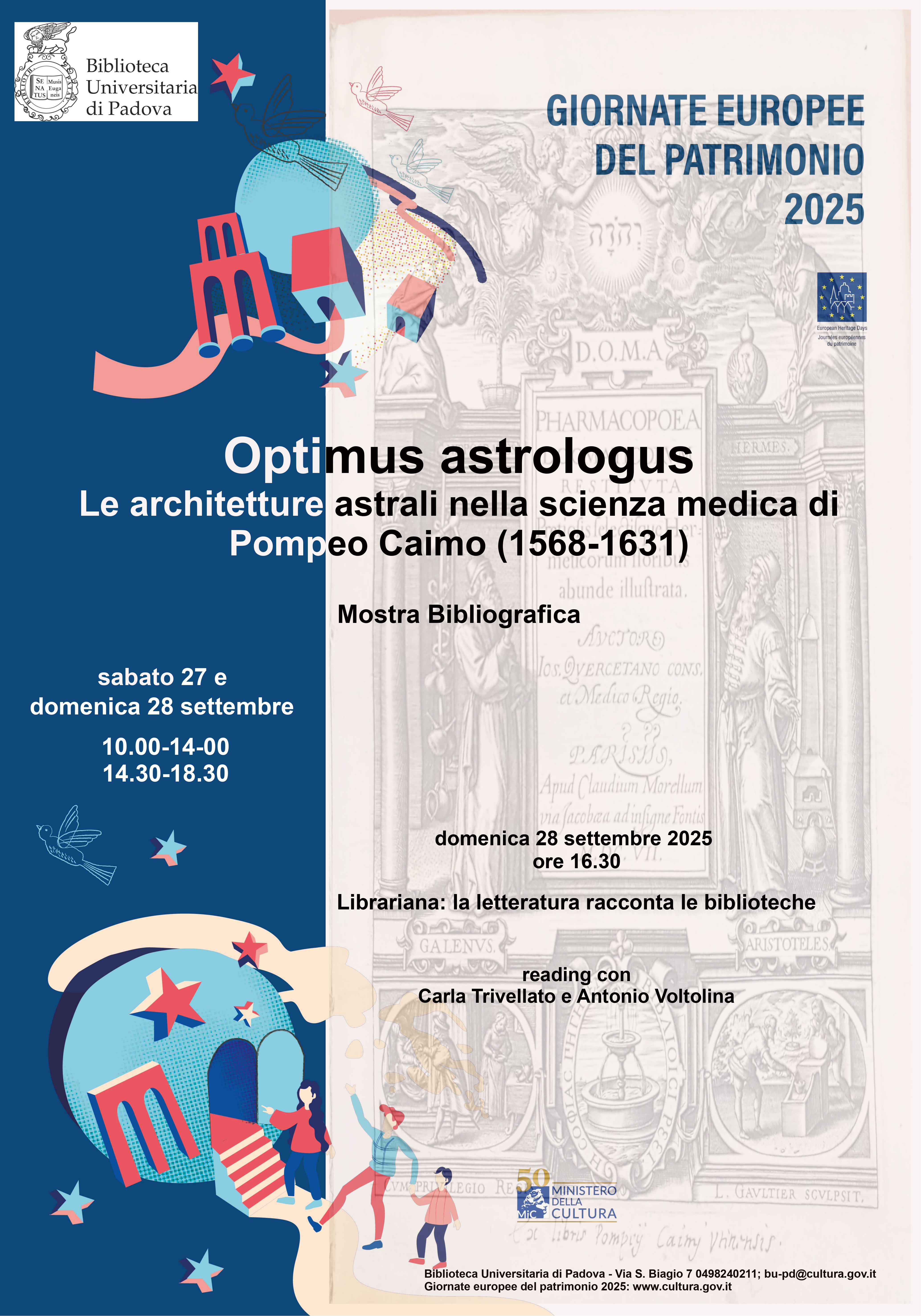 L’astromedicina e le sue implicazioni nella scienza medica di Pompeo Caimo: è questo il filone di interesse scelto per la mostra bibliografica in occasione delle Giornate europee del patrimonio di sabato 27 e domenica 28 settembre 2025 prossimi da Biblioteca Universitaria. Un approccio tanto interessante quanto inedito quello proposto per valorizzare il ricco patrimonio bibliografico appartenuto al medico udinese vissuto tra il XVI e XVII secolo, docente di medicina presso l’Università di Padova negli anni compresi tra il 1624 e il 1631 e oggetto di una recente catalogazione completa a cura del dott. Lorenzo di Lenardo grazie ad un progetto curato dalla Prof. Laura Casella per l’Università degli Studi di Udine: la mostra sarà, infatti, dedicata a riscoprire alcuni tra i preziosi volumi donati dalla famiglia nel 1636 alla biblioteca. ”Optimus habebatur Astrologus” [era ritenuto ottimo astrologo]: così era considerato il Caimo dai suoi contemporanei. I testi esposti spazieranno dunque dalla matematica e geometria, all’astronomia e cosmologia, anatomia e farmacologia, passando per quella che può essere definita l’applicazione della filosofia ‘naturale’ alle vicende umane, l’astrologia appunto, ovvero allo studio di quanto il cosmo e le stelle avessero un’influenza sulla salute degli uomini, sulla loro vita e sul loro stesso destino. Oroscopi, effemeridi, stelle e sfere celesti, astronomia e astrologia: questi i fili conduttori di un sistema di conoscenze che oltre ad attrarci per la loro ricchezza culturale ci sapranno accompagnare in un percorso bibliografico di grande bellezza e fascinazione © 2021 MiC - Pubblicato il 2025-09-01 10:16:57 / Ultimo aggiornamento 2025-09-01 13:06:57