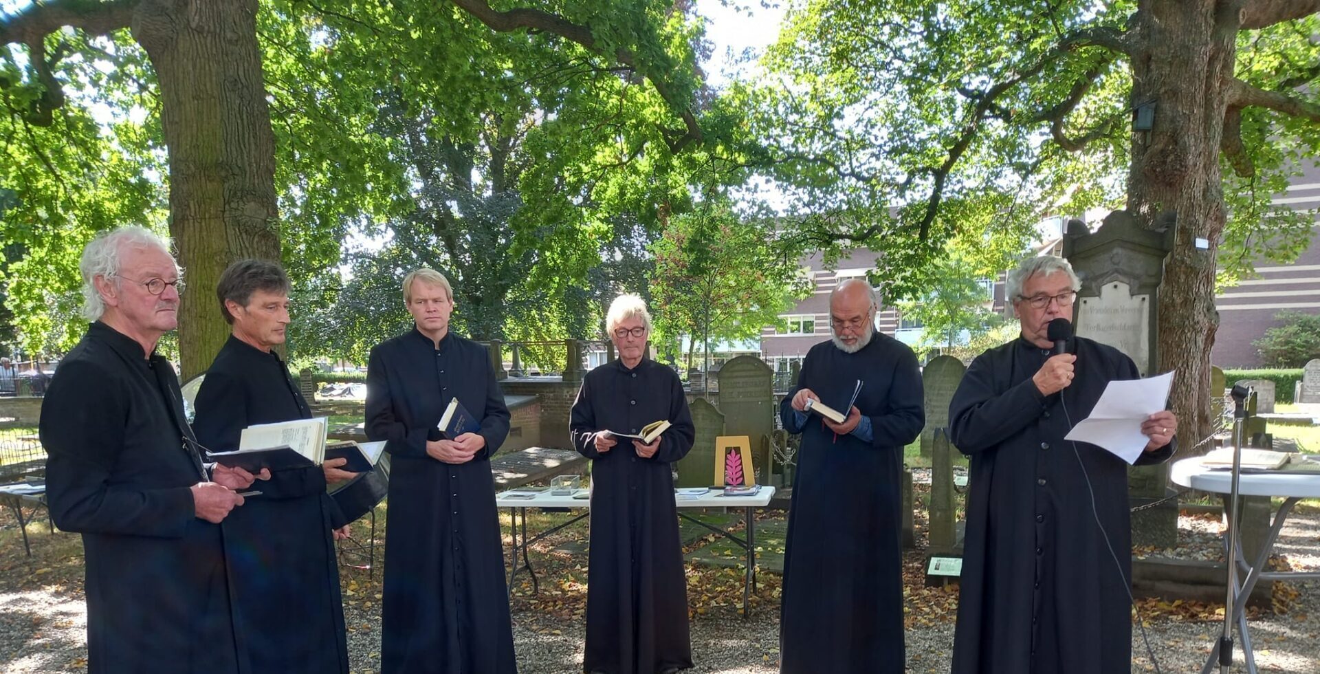Om 14.30 uur treedt Schola Cantorum op op de begraafplaats Ter Navolging In juni 2021 bestond de Schola Cantorum Tiel 50 jaar. Een veelgevraagd Tiels koor dat de eeuwenoude muziek van de Katholieke Kerk levend houdt. Overal waar het koor optreedt, zorgen de leden met hun gezangen die vaak in het geheugen gegrift zijn, voor vreugde en herkenning. Altijd zijn er na een optreden reacties enthousiaste en vaak ontroerende reacties van de bezoekers. Voor veel mensen zijn de gezangen een feest van herkenning en vreugd. Als de Schola de gezangen verzorgt tijdens een viering is het aantal kerkgangers doorgaans het dubbele van het aantal mensen dat op een ‘normale’ zondag ter kerke gaat. Hoe het begon Tiel-Oost kreeg in 1965 een eigen katholieke wijkkerk. Al snel groeide er rondom het gebedshuis een grote kern van wijkgenoten, die zich nauw betrokken voelde bij ‘hun’ kerk. Zo was er bij de inwijding door kardinaal Alfrink al een contactraad, een collectantencollege, groepjes mensen voor de technische klussen, een bloem- en versiergroep, een koster en een dirigent van het grote kerkkoor. Eén wens kon niet direct in vervulling gaan. De kerk miste in de eerste jaren een passend pijporgel. Het koor moest zich behelpen met een elektronisch orgel. Dat orgel kwam er na jarenlang sparen en actie voeren in 1971. Maar toen was al het benodigde geld nog niet bijeengebracht. Ongeveer gelijktijdig gingen enkele studenten van de Katholieke Kerkmuziekschool in Utrecht een avondje stappen. Een van hen was Frits Hendrich, die dirigent was van het koor van de nieuwe kerk in ‘Oost’. In opperste stemming hief het groepje in een volle kroeg een bekend vierstemmig studentenlied aan. De vele aanwezigen luisterden aandachtig en vol bewondering. Het lied moest nog driemaal gezongen worden. Daarna was er gratis bier voor de zangers. Onder het genot daarvan ontstond het idee om de contactraad van Tiel-Oost een handje te helpen met de financiën voor het orgel. Zingen tijdens de hoogmis en collecteren bij de uitgang was het plan. Het zingen tijdens de mis werd een daverend succes en ……het Gregorius kwartet was geboren.