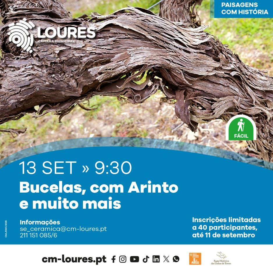 Percurso pedestre pelo património de Bucelas. Entre a serra da Alrota e o monte Serves, Bucelas é a beleza da paisagem que se estende bucólica por caminhos e veredas, da sua igreja matriz resplandecente num trono dourado, das suas vinhas que prenunciam o néctar dum Arinto fresco e jovem. Hora de encontro: 9h30 Local de encontro/chegada: Museu do Vinho e da Vinha, Bucelas Locais de interesse: Igrejas e capelas, Museu e núcleos museológicos, quintas, entre outros. Distância: 6 km Duração: 3 horas Dificuldade: fácil