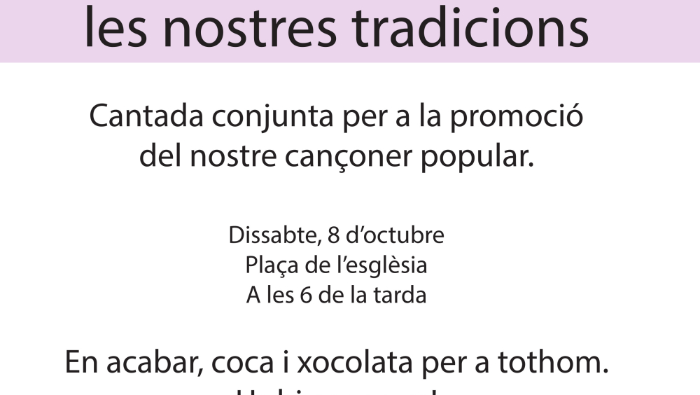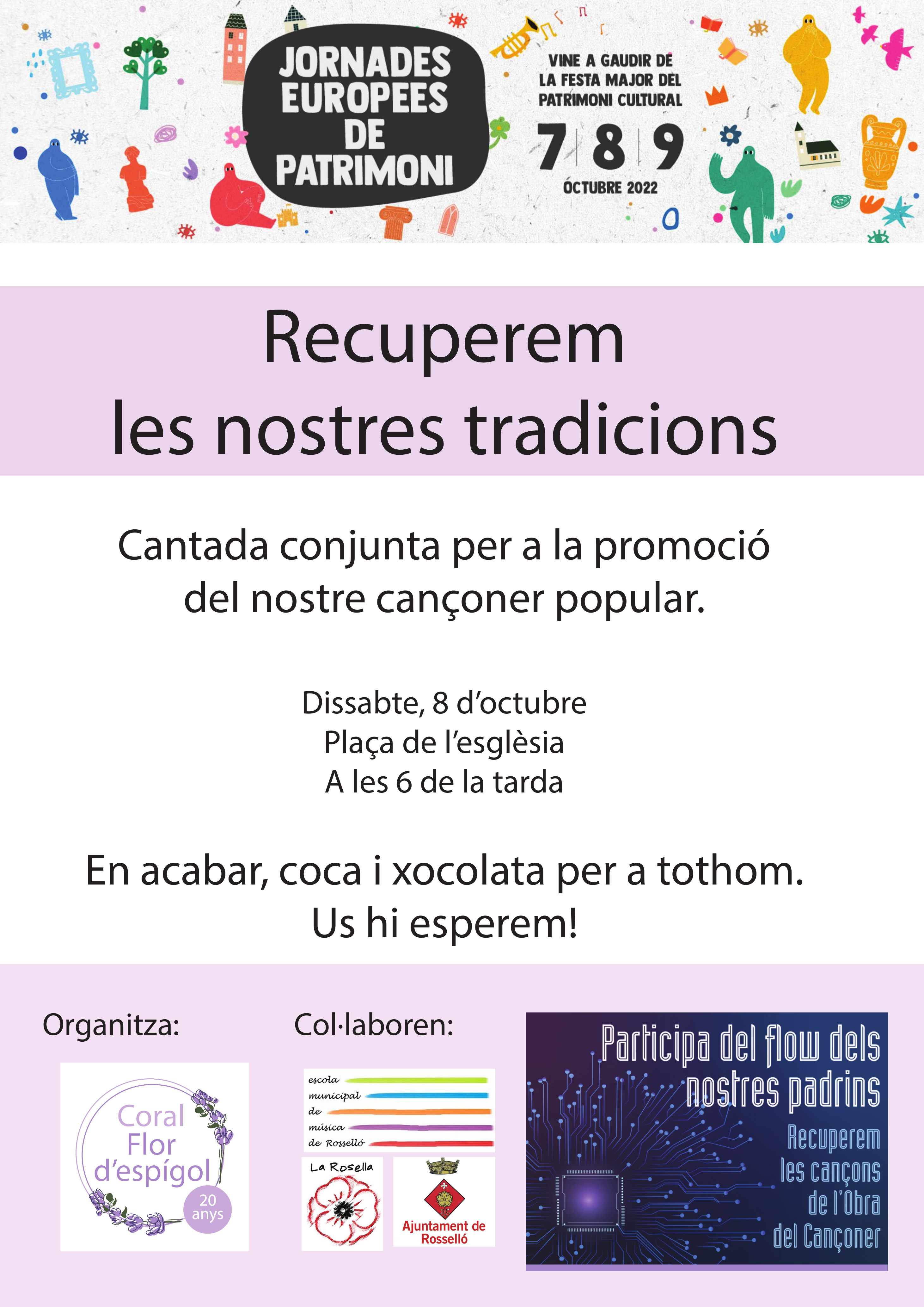 Volem potenciar la cançó popular com a element patrimonial cultural immaterial, com a eina de participació com a individu i com a col·lectiu. És per això que ens sumem a les propostes de diferents col·lectius i administracions al voltant de la commemoració del Centenari de la creació de l’Obra del Cançoner Popular de Catalunya. L'activitat consistirà en una breu explicació sobre l'OCPC. Llegirem els textos de les memòries de les missions que fan referència al nostre poble i cantarem algunes de les cançons recollides en aquestes contrades. We want to promote the popular song as an element of intangible cultural heritage, as a tool for participation as an individual and as a group. It is for this reason that we join the proposals of different groups and administrations surrounding the commemoration of the Centenary of the creation of the Obra del Cançoner Popular de Catalunya. The activity will consist of a brief explanation about the OCPC. We will read the texts of the memoirs of the missions that refer to our people and we will sing some of the songs collected in these regions.