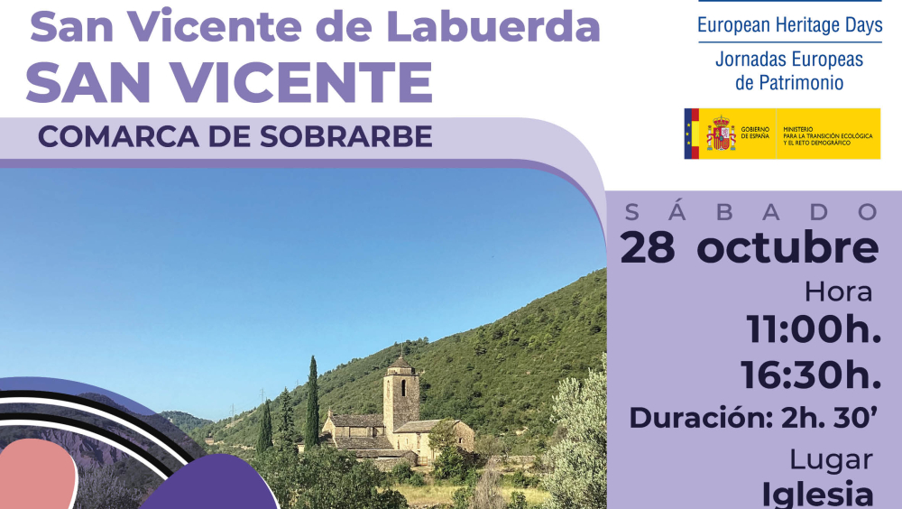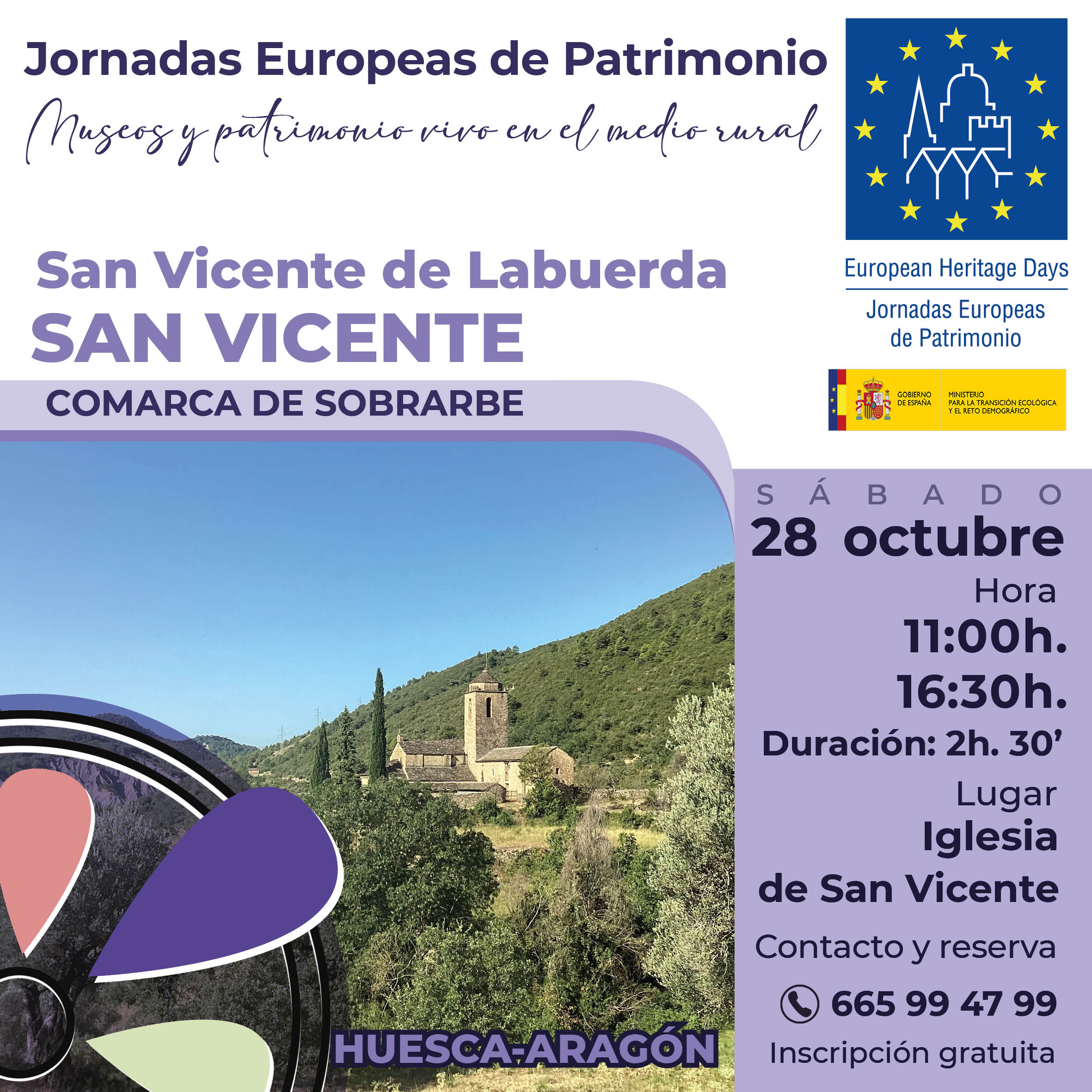 El conjunto eclesiástico de San Vicente de Labuerda, integrado por la iglesia románica, la abadía, el esconjuradero y el cementerio es el principal monumento de la población, de la que se encuentra apartado, emplazado en un altozano. La abadía, o casa del cura, fue restaurada en 2018 y en ella se conserva una pequeña colección de arte sacro. Para comprender este conjunto y la influencia que tuvo en la configuración de este territorio debemos posar nuestra mirada en el paisaje que lo rodea, recorrer los caminos que lo comunican con las ermitas de San Miguel y de San Visorio y visitar el pueblo de San Vicente. Fecha: 28 de octubre. Reserva imprescindible en el 665994799- 625412041 Horario: Mañana. 11 h Tarde: 16:30 h Duración de la actividad. Dos horas y media. Se recomienda llevar calzado cómodo y bebida.