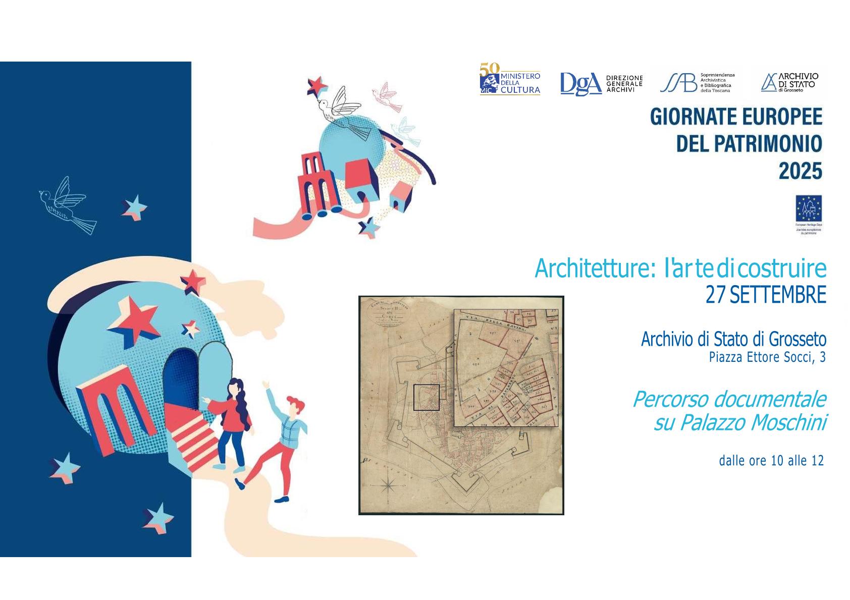 L’Archivio di Stato di Grosseto partecipa alle Giornate Europee del Patrimonio 2025 a tema “Architetture: l’arte di costruire”, proponendo per sabato 27 settembre 2025 un percorso documentale incentrato sull’interessante materiale storico relativo all’edificio che ospita l’Istituto, il settecentesco Palazzo Moschini. L’itinerario si svolgerà nelle sale dell’Archivio e sarà corredato da una cartografia tattile, volta ad ampliare l’accessibilità fisica, cognitiva e sensoriale della mostra che vuole essere anche un’occasione per avvicinare il grande pubblico alla storia del territorio. L’iniziativa si intreccia, infatti, con l’esposizione documentaria allestita nell’ambito del progetto PNRR “Archivi oltre le barriere”, mirante a una divulgazione maggiormente inclusiva del patrimonio archivistico. © 2021 MiC - Pubblicato il 2025-09-12 10:49:56 / Ultimo aggiornamento 2025-09-17 11:49:21
