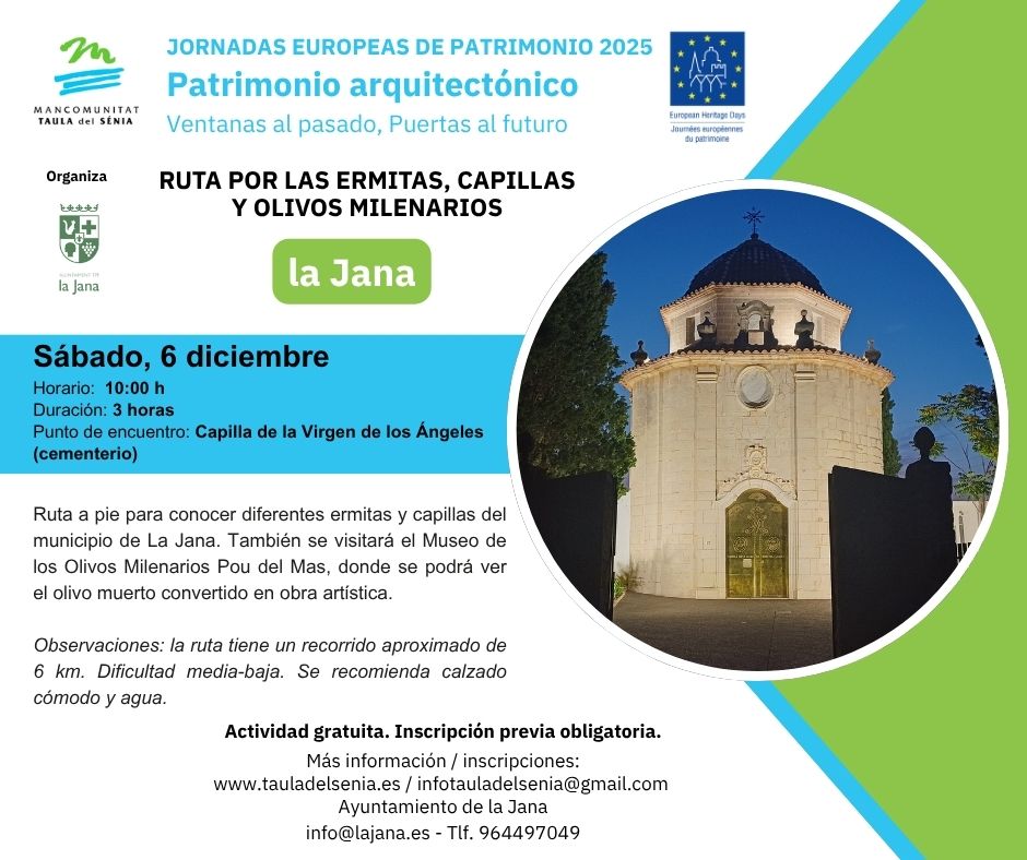 Ruta a pie para conocer diferentes ermitas y capillas del municipio de La Jana. También se visitará el Museo de los Olivos Milenarios Pou del Mas, donde se podrá ver el olivo muerto convertido en obra artística.