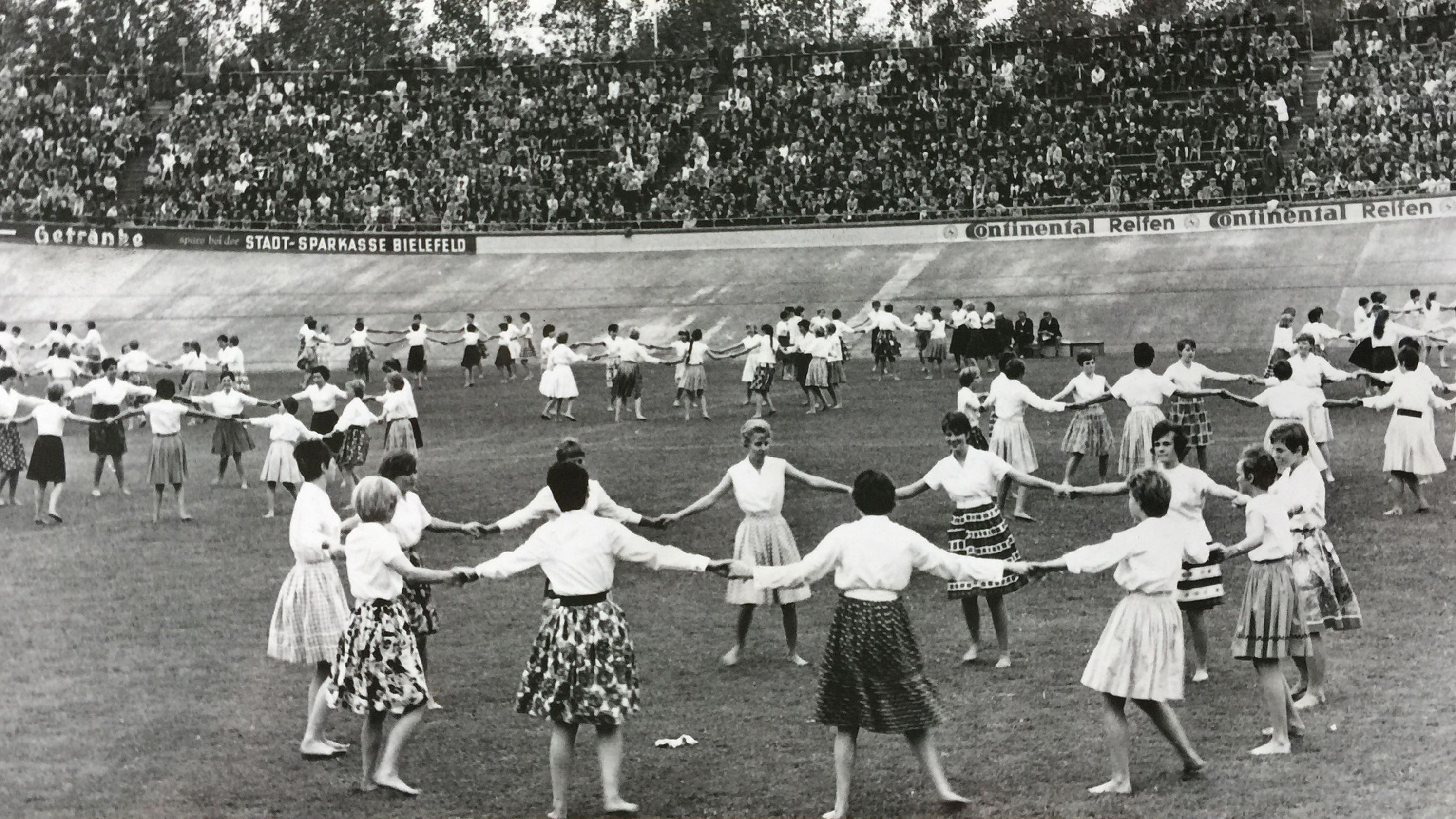 Die Radrennbahn wurde vom Architekten Clemens Schürmann aus Münster entworfen, in fugenloser Spannbetontechnik mit einer Kurvenneigung von 46 Grad erbaut und im Juni 1953 eingeweiht. Die Bahn gehört zu den schnellsten Betonpisten Europas. Neben radsportlichen Höhepunkten fanden hier kulturelle und politische Ereignisse wie Polizeisportfeste, Boxkämpfe, Reitturniere, Konzerte sowie Reden von Konrad Adenauer und Erich Ollenhauer statt. Noch heute ist sie Austragungsort von Steherrennen.