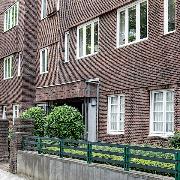 A fine example of a modernist building, the eight-storey structure designed in 1929 by architect Joe Ramaekers occupies a strategic corner position, emphasised by a slightly protruding polygonal tower. Purple "Belvedere" bricks cover the 65 m facade. While the exterior features relatively simple moulding, the interior has been decorated with particular care. Just look at the brick pilasters in the lift shafts, the stained glass windows in the stairwells and corridors, the buff earthenware tile facings with granite edging, the lighting fixtures and the floors with contrasting marble paving. Architecture enthusiasts will have clearly perceived, from all these elements, the pervasive influence of the modernist expressionism of the Amsterdam School. (CL 16/03/1995)