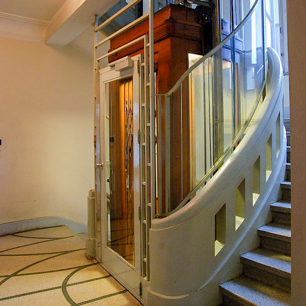 Occupying the corner of Avenue de Villegas and Avenue Charles-Quint, the Basilique residence stands out not only for its size, but also for its sober, white-coated facades which, at the time of its construction, contrasted with the surrounding, predominantly brick buildings. Architect Jean Delhaye was responsible for this building, for which he designed every detail. He was already putting into practice the principles set out in a manual that he published in 1946 under the title "L’appartement d’aujourd’hui" (The apartment of today). The Basilique residence is said to have served as a model for his work. Completed in 1938, the building has an Art Deco style tinged with modernism. Two gentle curves connect on either side of a central pilaster to form an angle as accomplished as it is unusual. Jean Delhaye remained in Victor Horta’s studio until 1946. He was one of the last pupils of the master, who inspired him so much, particularly in the perfect layout of interior spaces, the interplay of curved lines and the importance given to light. A double glass door with geometrically patterned ironwork leads into a vestibule clad in beige and black marble. This provides access to the elliptical stairwell around which the building is organised. The particularly elaborate open-shaft lift is located at the centre of a granite-clad concrete spiral staircase serving every floor. (CL 19/04/2007)