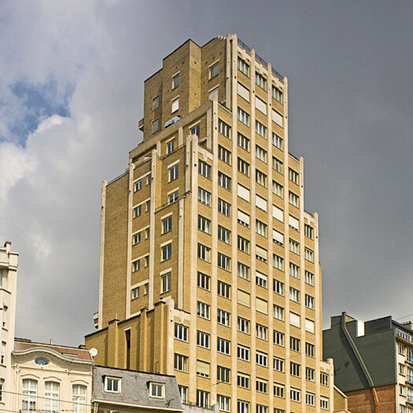 With its 17 floors, some consider the Résidence de la Cambre to be Brussels’ first skyscraper. Commissioned by developer Gérard Kaisin, who was already involved in the construction of the Pavillons Français in Schaerbeek, the building was completed in 1937 to plans by architect Marcel Peeters, who adopted a New York Art Deco style. It’ has even been dubbed the "Chicago Tower", due to its powerful, symmetrically stepped silhouette. On top of the concrete frame, the facade was clad with bluestone on the entire ground floor and in the end bays over three storeys. The rest, apart from the white stone bands on the first three floors, is punctuated by high pilasters with orange brick spaces. A granite frame marks the entrance door, which leads into a vast hall with a stone-clad floor decorated with black marble diamonds. A staircase leads with a certain majesty to the lifts and other corridors. (CL 15/07/2005)