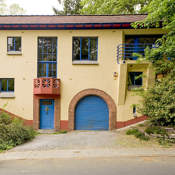 A year before designing the Queen Elisabeth Medical Foundation in Jette, architect Henry Lacoste had this house built as his residence. The year was 1926, and he adopted a rather eclectic Art Deco style, fusing modernism and the Streamline Moderne style with Mediterranean elements stemming from his interest in ancient civilisations. The asymmetrical facade features a series of bays of varying shapes, including a five-sided oriel on the left corner. Lacoste did not hesitate to combine colours, choosing an electric blue for the metal frames, balcony railing, entrance door and garage door, yellow for the wall rendering, and an ochre brown for the cornice and base that matches the dark red of the bricks in the door frames and between the three ground-floor windows. (CL 22/11/2012) In collaboration with Bertrand Terlinden (FR/EN) and Bruxelles Bavard (FR/NL). Guided tour in Belgian French sign language - Saturday and Sunday at 13:00.