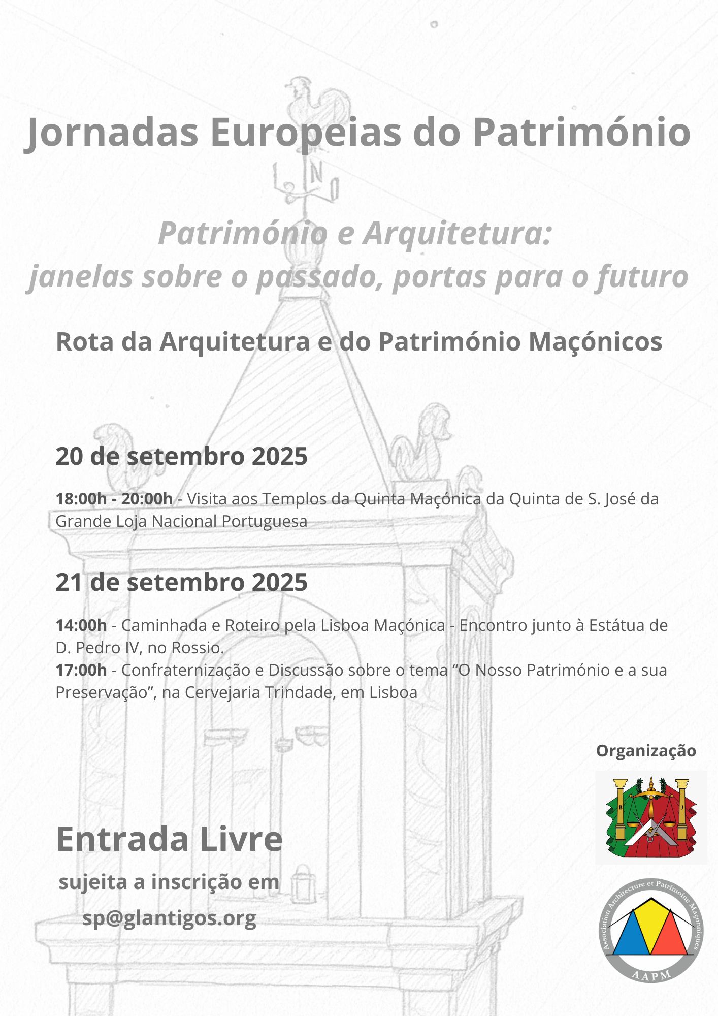 No âmbito das Jornadas Europeias do Património 2025, subordinadas ao tema “Património e Arquitetura: janelas sobre o passado, portas para o futuro”, terá lugar a Rota da Arquitetura e do Património Maçónicos, uma iniciativa cultural e histórica aberta ao público. 20 de setembro de 2025 – será possível visitar os Templos da Quinta Maçónica da Quinta de São José da Grande Loja Nacional Portuguesa, numa oportunidade rara para conhecer de perto um espaço de grande simbolismo e valor arquitetónico. 21 de setembro de 2025 – pelas 14h00, inicia-se uma caminhada e roteiro pela Lisboa Maçónica, partindo da Estátua de D. Pedro IV, no Rossio, percorrendo locais emblemáticos da capital onde se refletem símbolos, histórias e influências maçónicas. O percurso culmina na Cervejaria Trindade, às 17h00, onde terá lugar um momento de confraternização e uma conversa sobre o tema “O Nosso Património e a sua Preservação”. A atividade procura valorizar e dar a conhecer o legado cultural, arquitetónico e simbólico da Maçonaria em Portugal, inserindo-o na história mais ampla da cidade de Lisboa e no património europeu.