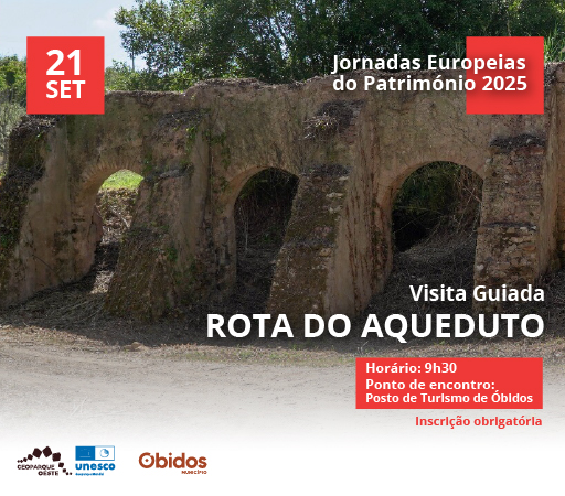 A "Rota do Aqueduto – Visita Guiada" convida a descobrir a importância do Aqueduto de Óbidos, uma das mais notáveis obras de engenharia hidráulica da região. Ao longo do percurso, os participantes serão guiados por técnicos do município que irão revelar mais sobre o seu enquadramento histórico, o aproveitamento da paisagem, a função na distribuição de água e curiosidades sobre a própria construção. A visita pretende valorizar o património arquitetónico local, promovendo a sensibilização do público para a importância da preservação, salvaguarda e valorização do Património Cultural. Esta visita enquadra-se nas Jornadas Europeias do Património - "Património Arquitetónico: Janelas para o Passado. Portas para o Futuro" numa parceria entre o Município de Óbidos e o Geoparque Oeste.