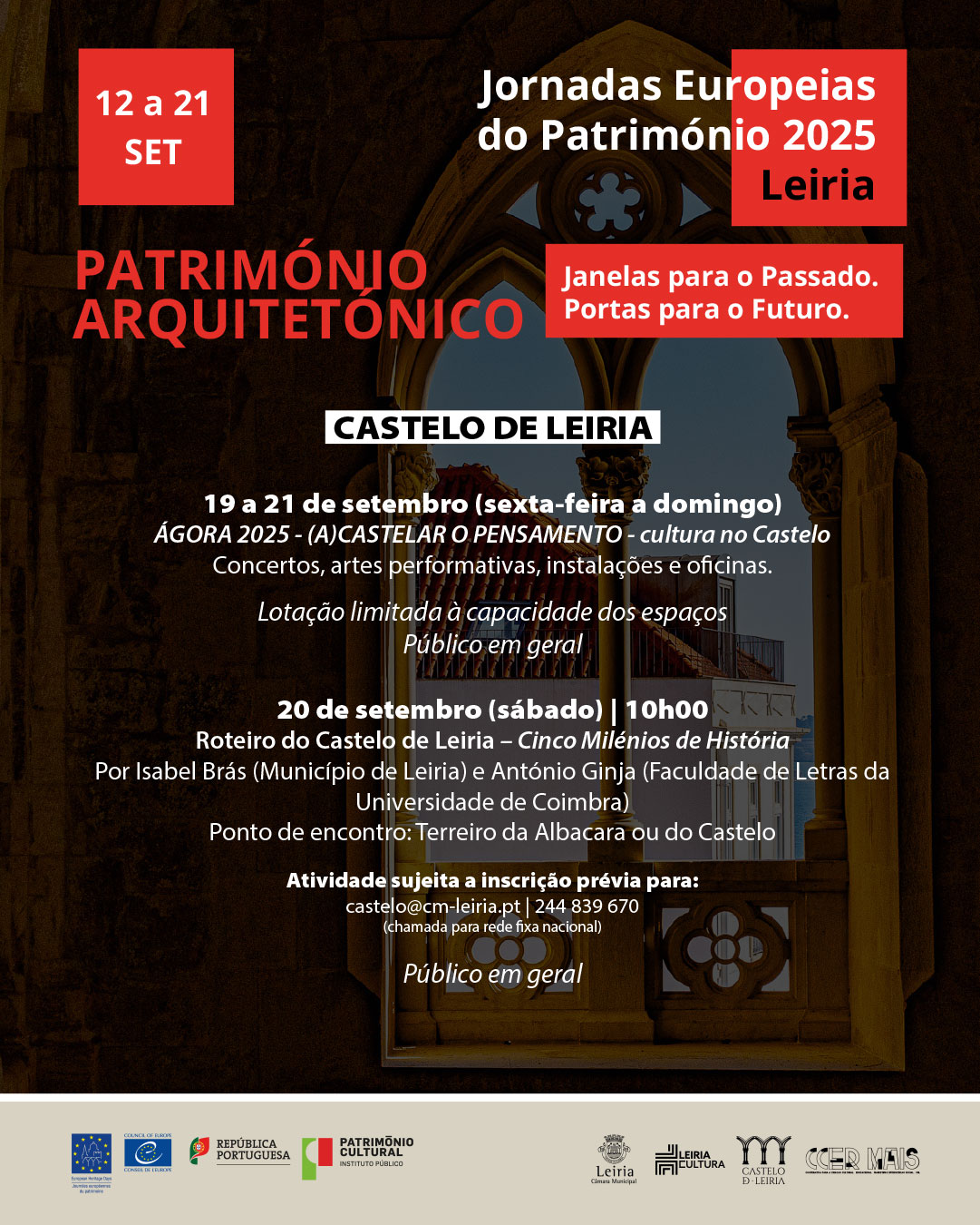 Visita orientada para descobrir a história do Castelo de Leiria, da origem do povoado à atualidade, desde o sítio arqueológico ao monumento construído. Monumento Nacional desde 1910, o Castelo de Leiria e o lugar onde está implantado narram uma história multissecular, com ocupações humanas que remontam pelo menos há 5000 anos. Estrategicamente posicionado entre Coimbra e Santarém, o castelo leiriense edificado em 1135, testemunhou importantes acontecimentos da História de Portugal ao longo de mais de cinco séculos, desde lutas contra os mouros, às primeiras cortes com representação popular. Incondicionalmente ligado às lendas de D. Dinis e D. Isabel, vem a cair em abandono e ruína desde o século XVII, para mais tarde, a partir dos inícios século XX, ser alvo de restauro pela mestria e devoção de Ernesto Korrodi. Os diversos trabalhos arqueológicos que têm vindo a ser realizados revelam uma intensa ocupação do espaço amuralhado onde hoje se ergue o Castelo. Os resultados obtidos permitem novas abordagens sobre a diacronia de ocupação do sítio, levantando-se novas hipóteses de interpretação sobre as vivências dos habitantes que sucessivamente escolheram este morro como habitat.
