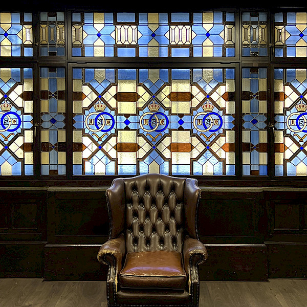 Thanks to the dynamism of the Royale Union Saint-Gilloise, the Joseph Marien stadium has already seen a number of lively sporting events. Surrounded by the greenery of Duden Park, the complex in its current state was inaugurated by Prince Charles of Belgium on 29 August 1926. It was decided to build a new grandstand along Chaussée de Bruxelles, which can still be seen today. The decision to modify the stadium was taken at the end of the 1925-1926 season, but the complex had already been in use for some time, since its official opening was reported on 14 September 1919. In those days, players had changing rooms in the park, and reached the stadium by descending stairs in the middle of the standing areas of the "popular" block. The situation had already improved considerably, since sportsmen had previously had to make do with Place Van Meenen and train on a lawn behind the velodrome in La Cambre wood. The Art Deco building was designed by architect Albert Callewaert and decorated with monumental sculptures by Oscar De Clerck. (CL 11/02/2010) Please note: the building is currently under restoration and surrounded by scaffolding, but the interior still holds many surprising treasures. In collaboration with Kurt Deswert and the Willemsfonds Brussels Hoofdstedelijk Gewest.