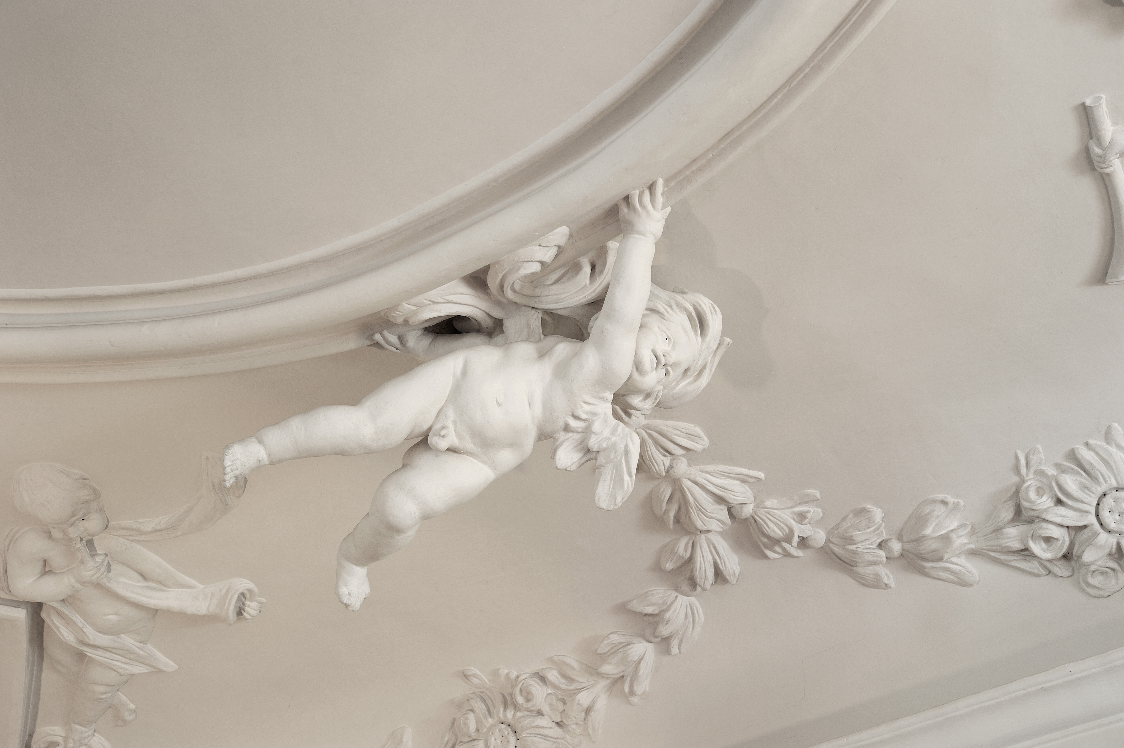 An den nachgotischen Mauerbau des alten Burghalden-Baus wurde ein rückwärtiger Teil angebaut, in dessen 1. Obergeschoss sich eine einzigartige Stuckdecke von 1710 befindet. Das Zentrum der Decke nimmt ein kreisrundes Mittelmedaillon mit einer kleinen sechsblättrigen Rosette ein. Am Medaillon hält sich im Süden und Norden je ein vollplastischer Stuckputto mit den Händen fest und scheint frei im Raum zu schweben. Entdecken Sie die beeindruckende Welt des Gipsstucks bei einer Führung und kombinieren Sie sie mit dem Workshop «Faszination Stuck in der Burghalde»!