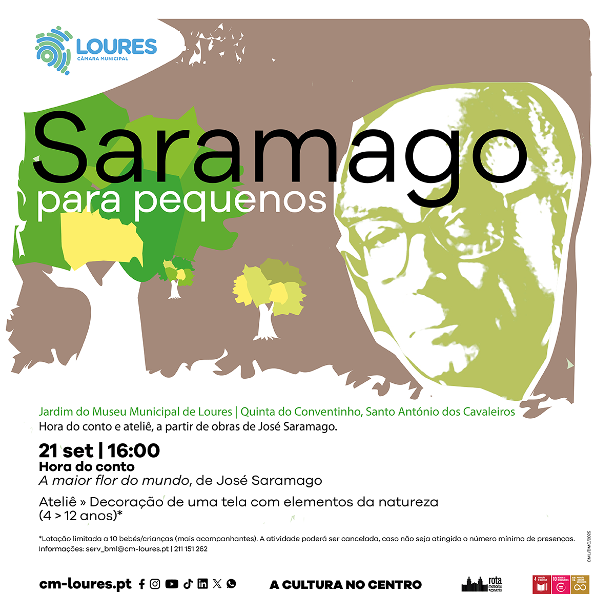 Saramago para Pequenos Hora do conto e oficina , a partir da obra de José Saramago, “A maior flor do mundo” A oficina consta da decoração de uma tela com elementos da natureza. Crianças 4>12 anos – nº máximo participantes, 10 crianças, acompanhadas dos pais Atividade desenvolvida no âmbito do projeto Rota Memorial do Convento.