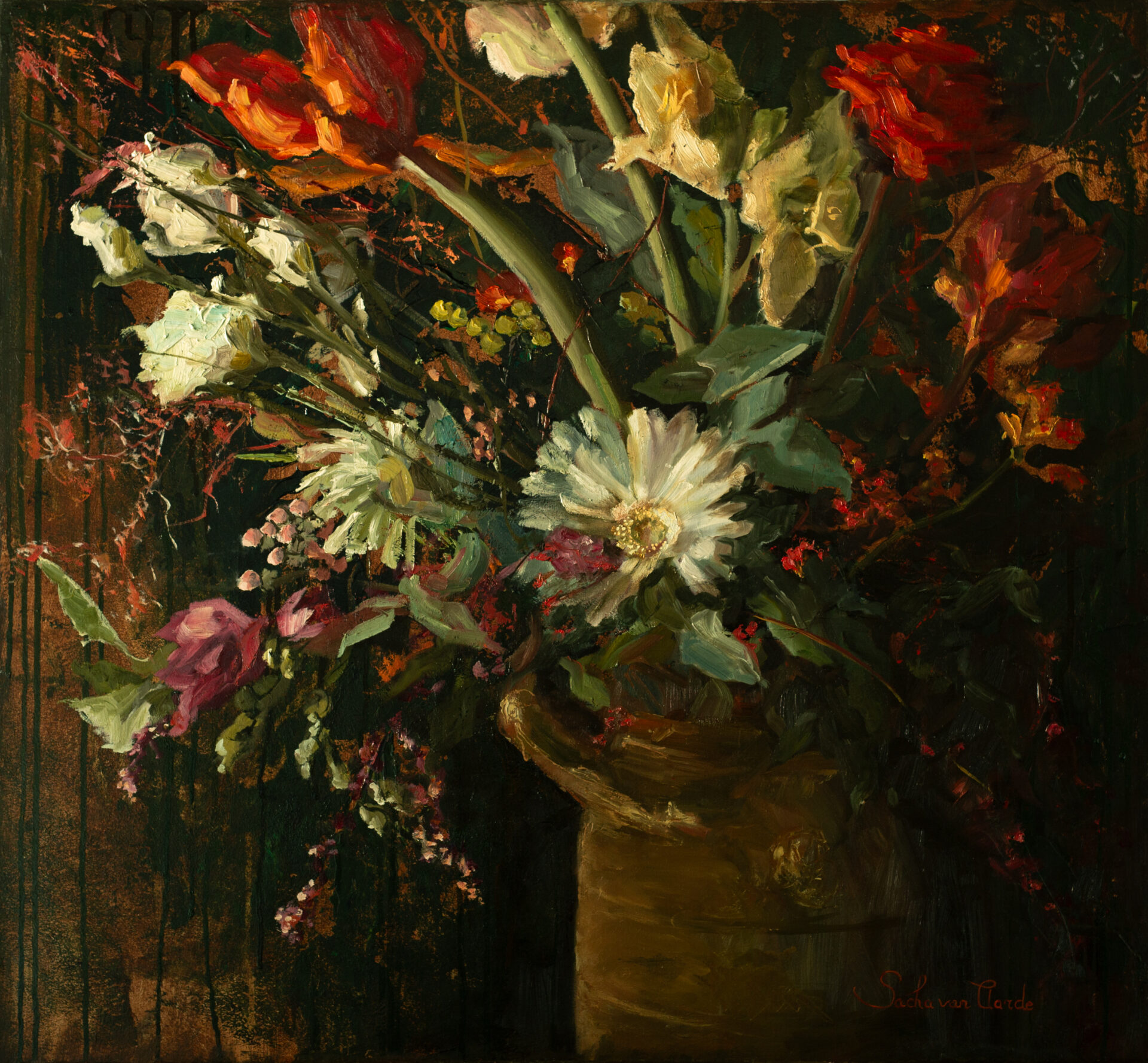 “Het leven is een wazig gevormd web van herinneringen, stiltes, gedachten en dromen” Sacha van Aarde (1973) is geboren in Hilversum, woonachtig in Bellingwolde en opgegroeid in het pittoresk Naarden Vesting en Giethoorn. Mijn levens ervaringen uit het verleden en heden, inspireert Sacha om haar verhaal te vertellen. Alles wat gebeurt is kan ze in haar verhalen op het doek kwijt. Kunst is een manier voor haar om haar levenservaringen te verwerken en om er mee om te gaan. Sacha schildert letterlijk haar verhalen door de ruimte heen. In 2019 besluit Sacha invulling en persoonlijke groei te geven aan haar leven om het basisjaar aan de klassieke academie te gaan volgen. Dit gaf haar zoveel voldoening , dat ze daarna de vakopleiding en de twee master jaren is gaan doen. In haar interieurs wil Sacha het leven laten zien, het menselijke zonder mens. Met compositie, sfeer, licht en het ruimtelijke wil ze het gevoel dat zich in de ruimte bevindt bij de kijker overbrengen. Door beelden van herkenning en nostalgie wordt de kijker meegenomen op haar innerlijke reis langs gevoelens van beroering, melancholie, kwetsbaarheid, eenzaamheid en verlangen. Naast interieurs schildert Sacha ook graag bloemen. Van knoppen tot volle bloei, zo laat zij op persoonlijke wijze haar groei in haar leven zien. Door met intuïtieve schildertoetsen en penseelstreken te werken geeft ze met licht en donker, contrast en kleurenspel haar gevoel en vrijheid weer en zorgt ze voor beweging, warmte, romantiek en geluksgevoel. Sacha werkt het liefst met olieverf en soms ook met gemengde technieken op paneel of linnen, waarbij ook structuur, dikke en transparante lagen meewerken in het geheel, om zo diepte en dimensie toe te voegen in haar werk “Vorig jaar ben ik voor het eerst uitgenodigd om te gaan exposeren in het kerkje in Vriescheloo. Open monumentendag is een laagdrempelige activiteit binnen de gemeente waar in ik woon. Een mooie manier om mij als kunstenares te laten zien in een mooie ambiance en mensen te ontmoeten en kennis te laten maken met mijn werk.”