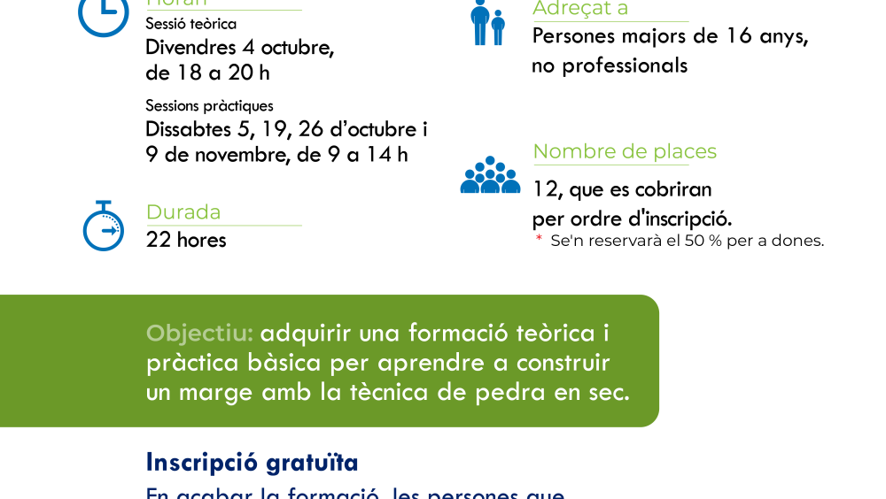 El objetivo del curso es proporcionar a los participantes una formación de piedra en seco de nivel básico, realizando la restauración de un muro de bancal. De esta forma, se pretende acercar a la población local a una técnica incluida en la lista del Patrimonio Cultural Inmaterial de la UNESCO, que ha permitido construir bancales, paredes, caminos y multitud de estructuras ligadas a las actividades agrícolas, ganaderas y forestales de la isla. Se estima que sólo en la Serra de Tramuntana hay más de 19.000 km lineales de muros de bancal.