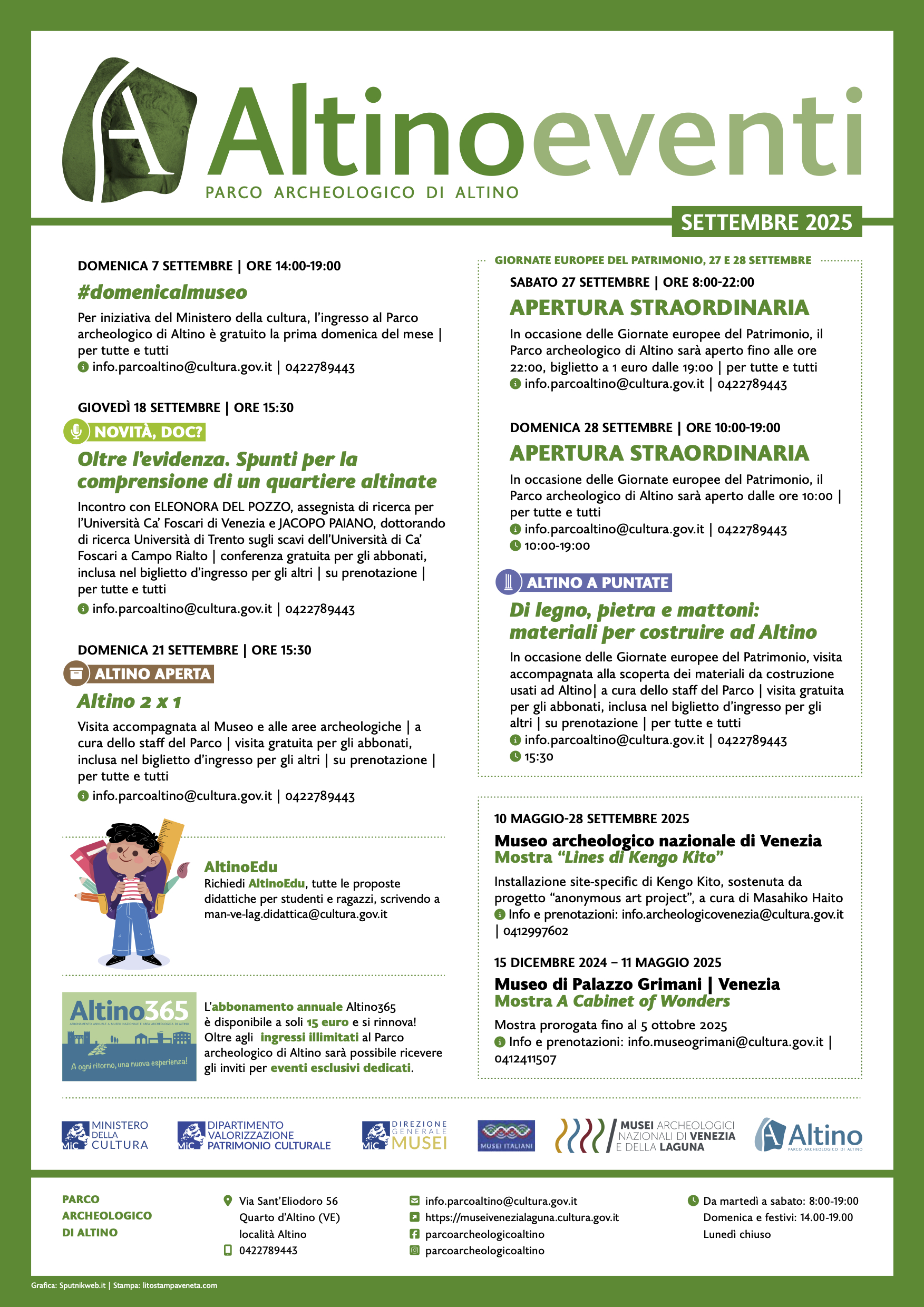 Cara visitatrice, caro visitatore, a settembre, il Parco archeologico di Altino apre: • dal martedì al sabato dalle 8:00 alle 19:00 • la domenica e festivi dalle 14:00 alle 19:00 • sabato 27 settembre dalle 8:00 alle 22:00 La prenotazione è obbligatoria per le scuole e i gruppi. Per prenotare si prega di scrivere all’indirizzo man-ve-lag.didattica@cultura.gov.it. Da non perdere Per tutte e tutti: • domenica7 settembre, dalle 14:00 alle 19:00, #domenicalmuseo, il Parco sarà aperto con ingresso gratuito per la prima domenica del mese; · giovedì 18 settembre, alle 15:30, Oltre l’evidenza. Spunti per la comprensione di un quartiere altinate, conferenza a cura della dott.ssa Eleonora del Pozzo e del dott. Jacopo Paiano, gratuita per gli abbonati, inclusa nel biglietto d’ingresso per gli altri, su prenotazione; · domenica 21 settembre, alle 15:30, Altino 2x1, visita accompagnata gratuita per gli abbonati, inclusa nel biglietto d’ingresso per gli altri, a cura dello staff del Parco, su prenotazione; · sabato 27 settembre, dalle 8:00 alle 22:00, Apertura straordinaria, in occasione delle Giornate europee del Patrimonio il Parco sarà aperto fino alle 22:00, ingresso a 1 euro dalle 19:00; · domenica 28 settembre, dalle 10:00 alle 19:00, Apertura straordinaria, in occasione delle Giornate europee del Patrimonio il Parco sarà aperto con orario prolungato. Alle 15:30, Di legno, pietra e mattoni: materiali per costruire ad Altino, visita accompagnata gratuita per gli abbonati, inclusa nel biglietto d’ingresso per gli altri, a cura dello staff del Parco, su prenotazione. Fuori Museo: • 8 maggio-3 agosto 2025, LINES di KENGO KITO, installazione site-specific di Kengo Kito, sostenuta da progetto “anonymous art project”, a cura di Masahiko Haito, Museo archeologico nazionale di Venezia; • 8 maggio-3 agosto 2025, Lifelong Beauty, esposizione a cura di Lü Peng, Li Guohua e Carlotta Scarpa, organizzata da L-ART·CONTEMPORARY con Manuela Schiavano, presenta in anteprima nazionale il percorso artistico di Zhang Zhaoying, esponente della Nuova Generazione, Museo di Palazzo Grimani, Venezia; • 15 dicembre 2024-5 ottobre 2025, A Cabinet of Wonders, la mostra A Cabinet of Wonders. Una celebrazione di arte e natura. The George Loudon Collection evoca l’atmosfera dei “gabinetti delle meraviglie”, che furono diletto dei collezionisti e dei loro ospiti e origine dei musei, Museo di Palazzo Grimani, Venezia. IMPORTANTE Richiedi AltinoEdu! Tutte le proposte didattiche convenzionate con il Parco archeologico. Per riceverlo: man-ve-lag.didattica@cultura.gov.it L'abbonamento annuale #Altino365 è disponibile a soli 15 €! Oltre agli ingressi illimitati al Parco archeologico di Altino, sarà possibile ricevere gli inviti per eventi esclusivi dedicati. Il biglietto d’ingresso e l’abbonamento sono ora acquistabili anche tramite app Musei Italiani Seguite il Parco archeologico di Altino sulle pagine Facebook e Instagram @parcoarcheologicoaltino per conoscere tutte le novità in arrivo! Lo staff © 2021 MiC - Pubblicato il 2025-08-26 10:19:26 / Ultimo aggiornamento 2025-09-22 09:20:12