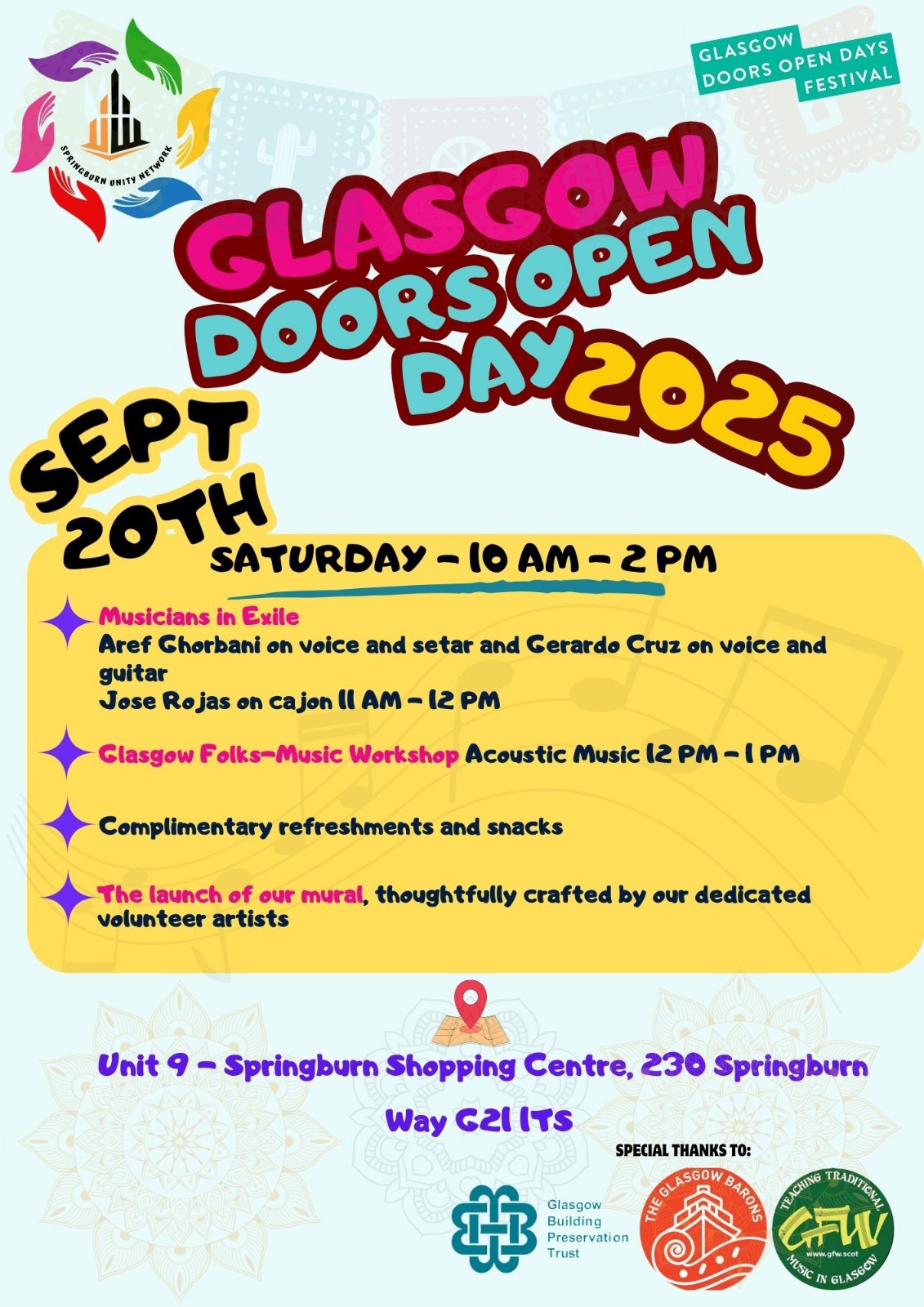 20 September 2025 (10:00 - 13:00) Our event will begin with registration at 10:00 on 20/09/2025 at our venue, followed by a welcome speech accompanied by tea, coffee, and juice. At 10:45, the art exhibition will commence. Our staff and volunteers will guide all participants through the showcase, which features artwork created by local artists as well as members of our group. During the exhibition, volunteers will also offer fun activities for children, including face painting, bracelet-making, and earring-making. At 12:00, we’ll enjoy lively ceilidh music and dancing, and the event will conclude with a multicultural lunch prepared by members of our group. We will be offering face painting for children aged 5 and above, and all children must be accompanied by their parents. Overview SUN is located inside Springburn Shopping Centre in a two-storey building, with entrances on both levels. Both floors are fully accessible for wheelchair users and include accessible toilet facilities. All access areas are currently well-maintained and in good condition.