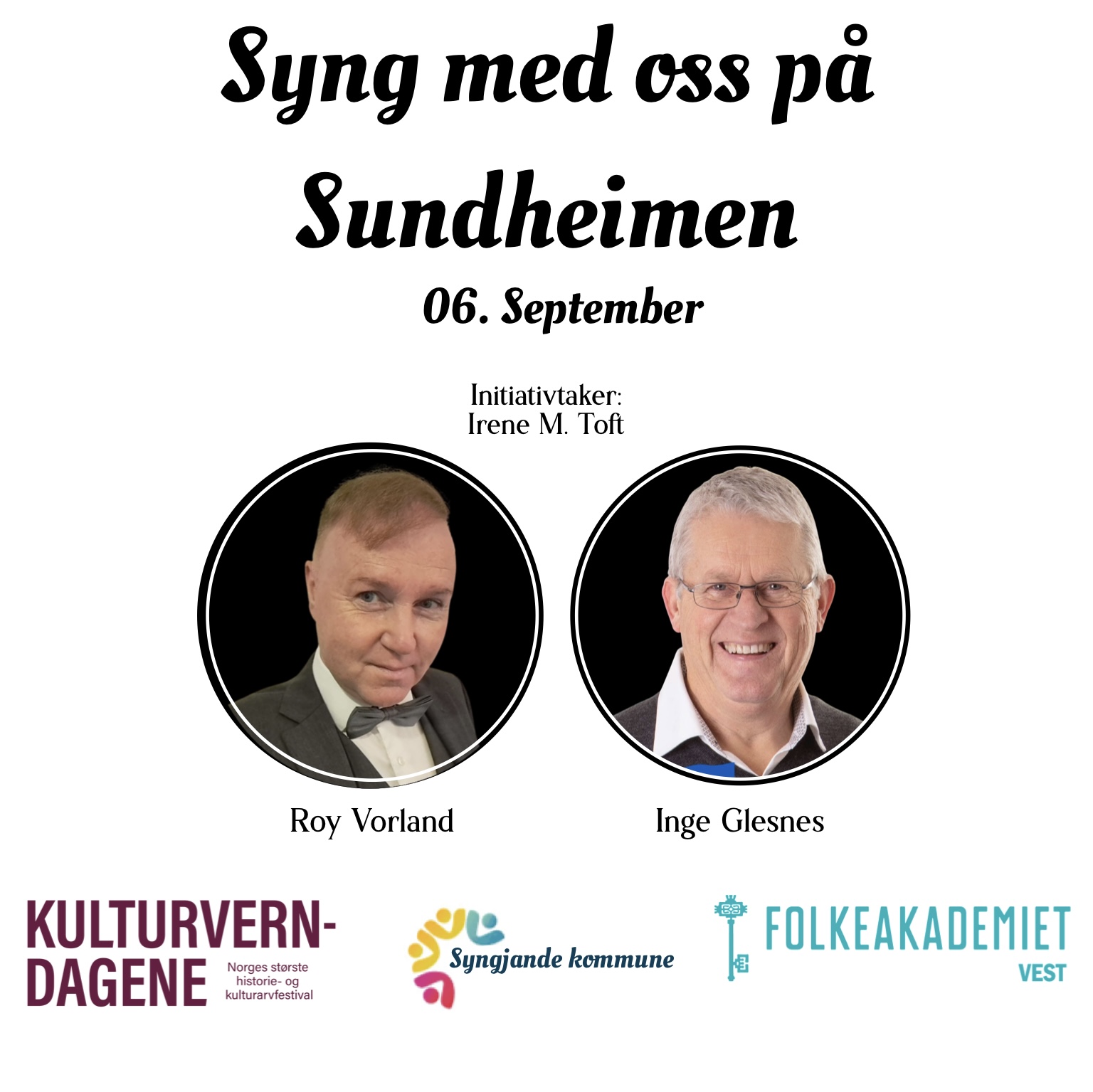 Velkomen til «Syng med oss» på Sundheimen. Etter initiativ av Irene M. Toft i 2011 har det vore allsong på Sundheimen i 24 år. Irene har leia «Syng med oss» og Arvid Torsvik har vore spelemann, og det fortset dei med. Denne laurdagen er Roy Vorland og Inge Glesnes gjestar og leiar denne songstunda. Tilbodet er for dei som bur på Sundheimen, og alle andre som vil være med og syngje denne dagen. Me set pris på at du klikker «skal» dersom du vil kome, slik at me har ei oversikt over antall sanghefter og plassar som trengs denne dagen. Hjarteleg velkomen!