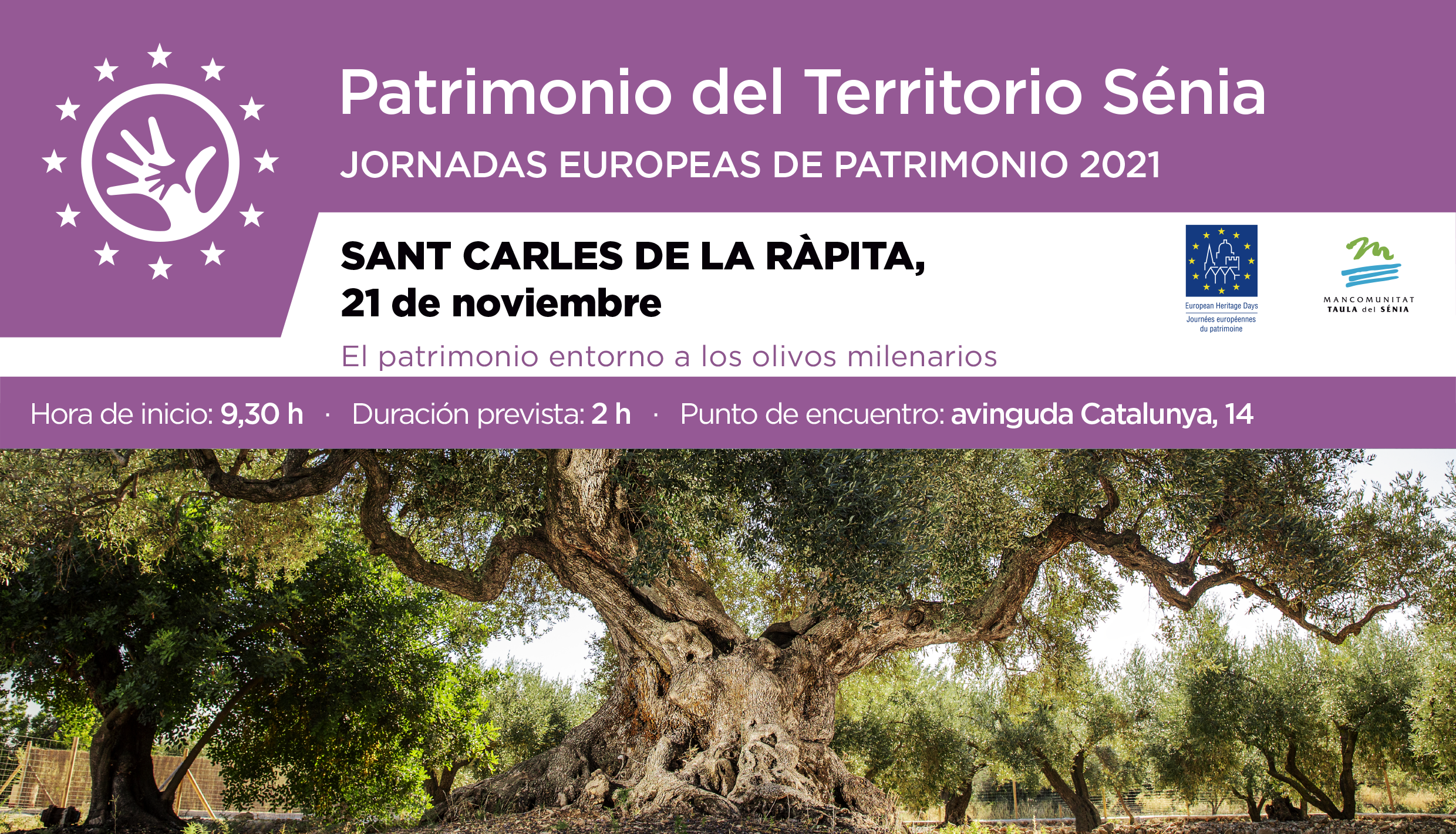 Salida a pie desde la avinguda Catalunya, 14, dirección a la antigua vía Val de Zafán, continuaremos por el camino de la Senieta, Partida Codonyol (término de la Ràpita y de Alcanar), para conocer los olivos milenarios de Sant Carles de la Ràpita, acompañados de los dos historiadores rapitencs Paco Carles Guardia y José Pitarch López y del guía del Club Centro Excursionista Socavón, Juan Moises Miguel. Vuelta por el mismo recorrido.
