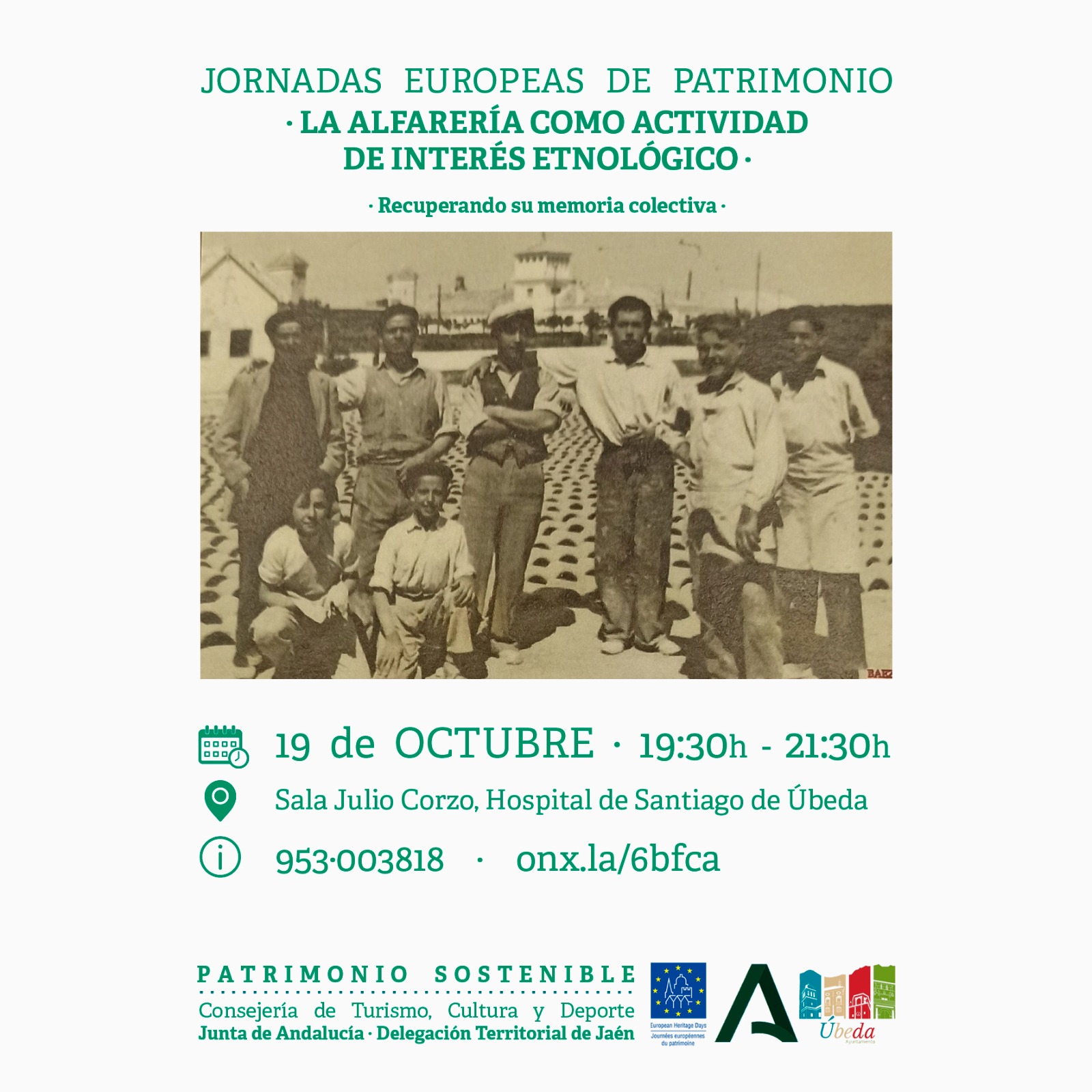 Conferencia sobre la reciente incoación de la Alfarería como bien de interés cultural. Intervienen: José Luis Madueño, Concejal de Comercio, Industria, Artesanía y Empresa en el Ayuntamiento de Úbeda, Francisco Martínez Villacañas, “Paco Tito” escultor y alfarero y Alfonso Hidalgo Cruz (Góngora), alfarero y ceramista. Modera: Francisco Jiménez Rabasco, etnólogo. Fecha y hora: 19/10/2022; mesa redonda de 19:30h a 20:30h; visita guiada al Taller Alfarería Tito a cargo de Juan Martínez Villacañas (Tito) y Juan Pablo Martínez Muñoz, con comienzo a las 21:00h. Aforo: Hasta completar aforo. Punto de encuentro: Sala Julio Corzo. Hospital de Santiago.