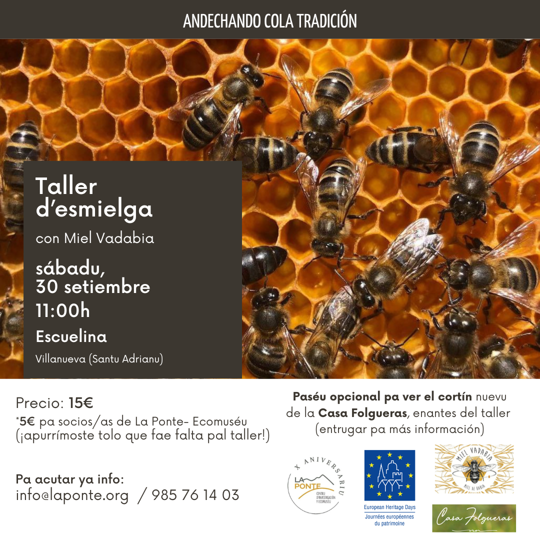 El sábado 30 de septiembre La Ponte-ecomuséu retoma el ciclo Andechando cola tradición con el Taller d’esmielga, un taller para conocer el proceso de producción, extracción y envasado de miel y resolver todas las dudas relativas al trabajo con las abejas. Una oportunidad para conocer nociones básicas de apicultura.