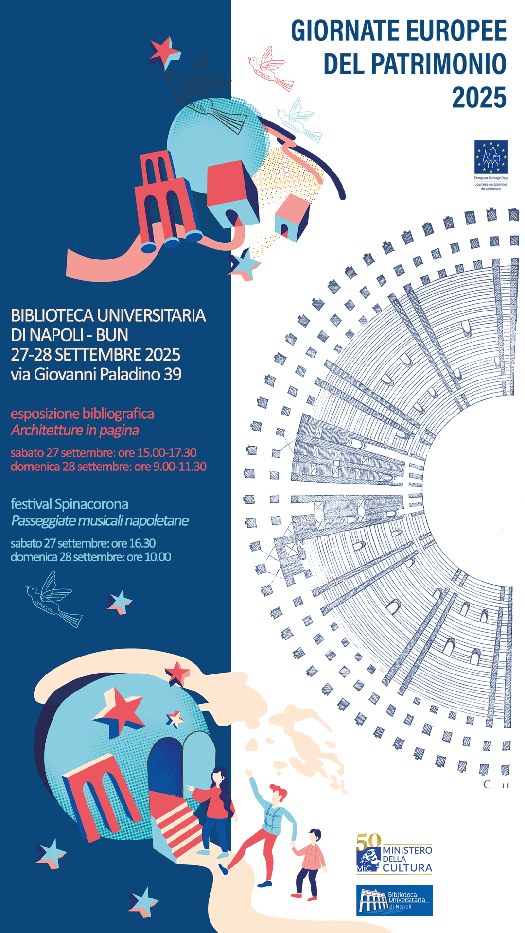 La Biblioteca Universitaria di Napoli partecipa alle Giornate Europee del Patrimonio 2025 “Architetture: l’arte di costruire” Tra pagine e melodie – La bellezza del sapere e la forza della musica In occasione delle Giornate Europee del Patrimonio 2025, la Biblioteca Universitaria di Napoli – BUN partecipa all’iniziativa promossa dal Ministero della Cultura con un doppio appuntamento dedicato al tema di quest’anno: “Architetture: l’arte di costruire”. La BUN accoglierà i visitatori con un’esposizione bibliografica incentrata sull’architettura e ospiterà, nel Salone Monumentale, due concerti del Festival Spinacorona. Passeggiate musicali napoletane. Un percorso pensato per creare un ponte tra l’architettura materiale e quella emotiva, tra lo spazio costruito e quello vissuto, mettendo in dialogo libri, musica e luoghi storici. Un’esperienza in cui il sapere scritto e la forza delle arti restituiscono nuovo significato all’ambiente architettonico. 📚 Esposizione bibliografica Architetture in pagina L’allestimento offrirà al pubblico un viaggio attraverso le grandi opere teoriche e pratiche dell’arte del costruire, dai trattati rinascimentali fino alle più recenti pubblicazioni sul paesaggio urbano e sull’architettura sostenibile. Tra le opere esposte, spiccano rare edizioni illustrate e preziosi testi del patrimonio storico della BUN. · sabato 27 settembre: ore 15.00-17.30 · domenica 28 settembre: ore 9.00-11.30 Festival Spinacorona. Passeggiate musicali napoletane I concerti, a ingresso gratuito, si svolgeranno nel Salone Monumentale della BUN, creando un dialogo suggestivo tra musica, architettura e memoria storica. · sabato 27 settembre, ore 16.30 STEFANIA CAFARO, pianoforte HAYDN Sonata HOB. XVI/37 Sonata HOB. XVI/46 Sonata HOB. XVI/52 · domenica 28 settembre, ore 10.00 ANGELO MONTANARO, clarinetto FLORIAN BERNER, violoncello KATHARINA KEGLER, pianoforte D’INDY Trio op. 29 Ingresso gratuito fino a esaurimento dei posti. L'accesso ai luoghi sarà possibile 30 minuti prima dell'inizio di ogni concerto. Non è possibile effettuare prenotazioni. Biblioteca Universitaria di Napoli – Via Giovanni Paladino, 39 Esposizione bibliografica: sabato 27 settembre, ore 15.00-17.30 - domenica 28 settembre, ore ore 9.00-11.30 Concerti Spinacorona: sabato 27 settembre, ore 16.30 - domenica 28 settembre, ore 10.00 bibliotecauniversitarianapoli.cultura.gov.it informazioni: bu-na.promozioneculturale@cultura.gov.it © 2021 MiC - Pubblicato il 2025-09-17 13:52:00 / Ultimo aggiornamento 2025-09-24 11:22:29