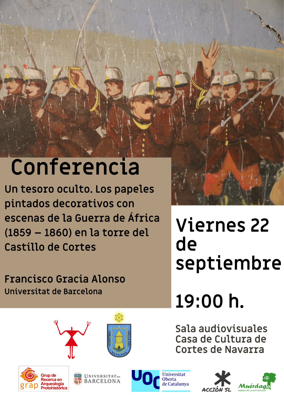Vamos a realizar una conferencia sobre los papeles pintados con escenas de la Guerra de África que tenemos en el torreón del castillo. Será impartida por el catedrático de Prehistoria y director del GRAP de la Universidad de Barcelona, Don Francisco Gracia Alonso.