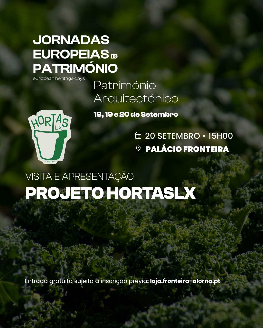 20 SETEMBRO 15h00 - Visita e Apresentação do Projeto HortasLx A HortasLx é um projeto de referência na promoção da agricultura urbana em permacultura, com foco na Grande Lisboa. Criamos e dinamizamos hortas regenerativas que aproximam pessoas da natureza e da alimentação saudável, aliando prática, educação e impacto social. Com mais de 100 hortas implementadas e parcerias com empresas, escolas e instituições, promovemos um cultivo ecológico e acessível a todos. Na visita ao Palácio Fronteira, será possível conhecer a nova quinta urbana da HortasLx, um espaço em transformação segundo os princípios da permacultura. A visita dará a conhecer as áreas de intervenção, os diferentes tipos de agricultura a implementar e o impacto social e ambiental esperado. Haverá ainda um momento de partilha sobre o património agrícola e as sementes, bem como uma breve apresentação do projeto HortasLx, da sua equipa e do trabalho desenvolvido. Duração: 1h30 Lotação máxima: 40 pessoas Idade mínima: 14 anos Entrada gratuita sujeita a inscrição prévia: loja.fronteira-alorna.pt