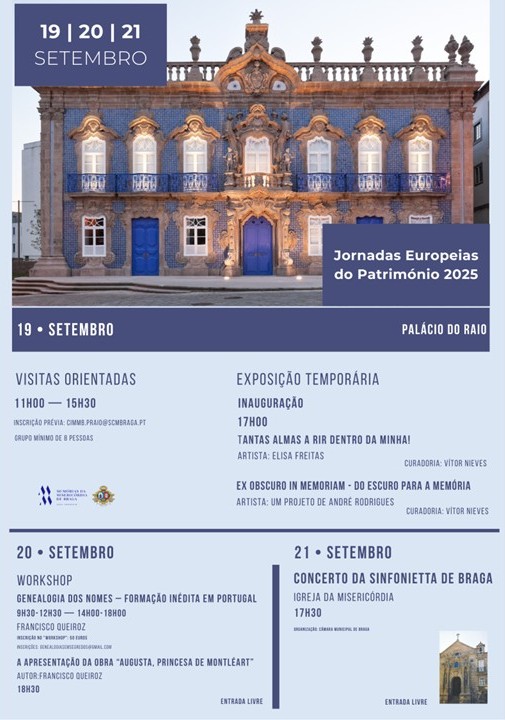 DIA 19 DE SETEMBRO VISITAS ORIENTADAS O Centro Interpretativo das Memórias da Misericórdia de Braga a promover visitas orientadas gratuitas ao Palácio do Raio com o propósito de dar a conhecer a história e o património da Santa Casa da Misericórdia de Braga. MANHÃ: 11H00 / TARDE: 15H30 Inscrição prévia: cimmb.praio@scmbraga.pt Grupo mínimo de 8 pessoas EXPOSIÇÃO TEMPORÁRIA INAUGURAÇÃO 17H00 "Tantas almas a rir dentro da minha!" Curadoria: Vítor Nieves Artista: Elisa Freitas Sinopse exposição: Tantas almas a rir dentro da minha é um projeto fotográfico realizado na Casa de Saúde do Bom Jesus em Braga e que propõe um olhar crítico sobre o papel das instituições médicas, das estruturas familiares e da sociedade sobre a forma como a doença mental feminina é vista e tratada. Partindo de uma ligação pessoal da autora ao tema, através da doença mental da sua avó, o projeto revisita fragmentos de histórias de mulheres marcadas pela negligência, pelo estigma e pela constante desvalorização do sofrimento psíquico, especificamente no feminino. Pretende-se criar espaço para escutar o que tantas vezes foi calado e para refletir sobre as desigualdades que ainda hoje persistem no modo como cuidamos, ou descuramos, a saúde mental das mulheres. "Ex obscuro in memoriam - Do escuro para a memória" Curadoria: Vítor Nieves Artista: Um projeto de André Rodrigues Sinopse exposição: Num acaso digital, um baú de arquivos locais chamou-me como quem sussurra memórias antigas. Dentro dele, repousavam chapas de vidro de uma casa de fotografia desaparecida, imagens sem nomes, sem datas, apenas rostos suspensos no tempo. Entre poeira e prata, trouxe à superfície fragmentos de memória, devolvendo-lhes respiração e brilho. Cada imagem restaurada tornou-se reencontro: de desconhecidos, de lugares, de uma cidade que guarda histórias nas sombras. Agora integradas no arquivo dos Encontros da Imagem, estas fotografias deixam de pertencer ao esquecimento, preservando vestígios de uma cidade e de um tempo que persistem, mesmo quando já não são lembrados e passem a habitar novamente a luz da memória coletiva.