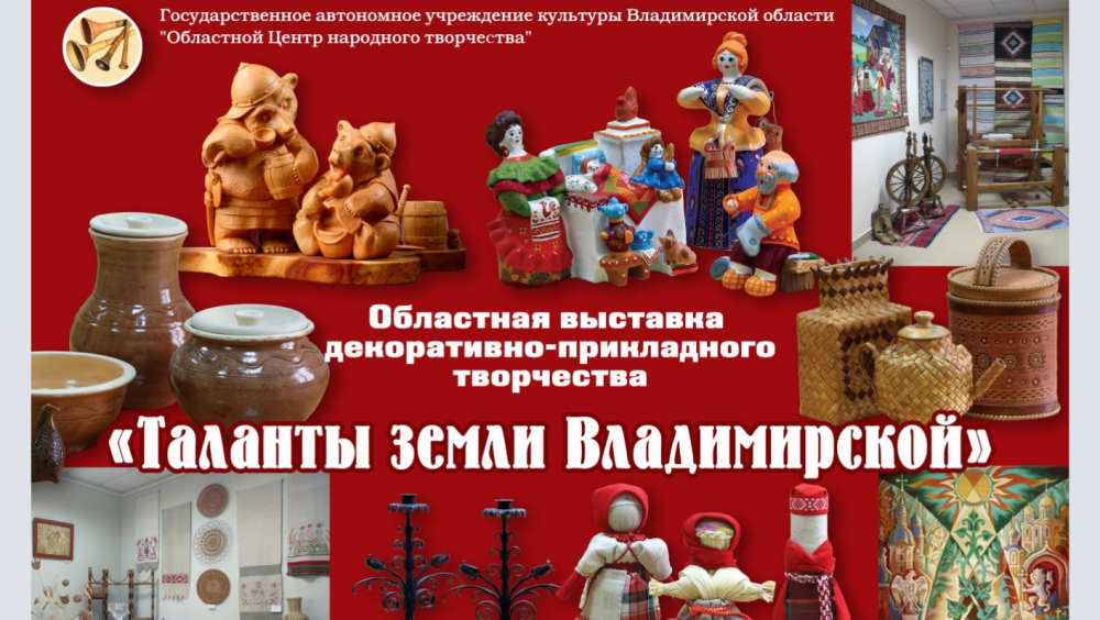 - В Доме народных мастеров работает постоянно – действующая выставка декоративно - прикладного творчества "Таланты земли Владимирской", которая объединила мастеров и умельцев из г. Владимира и 16 районов области. На выставке представлены все виды ремесел, бытующие в нашем крае: музыкальные инструменты "Владимирский рожок" - бренд Владимирской земли, белокаменная резьба, кузнечные и гончарные изделия, глиняная игрушка и народная кукла, плетение из природных материалов, резьба и роспись по дереву, вышивка и ткачество, лоскутное шитье и кружевоплетение, коллекция восстановленного русского народного костюма конца XIX начала ХХ веков Владимирской, Вологодской, Архангельской губерний.